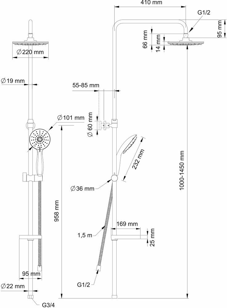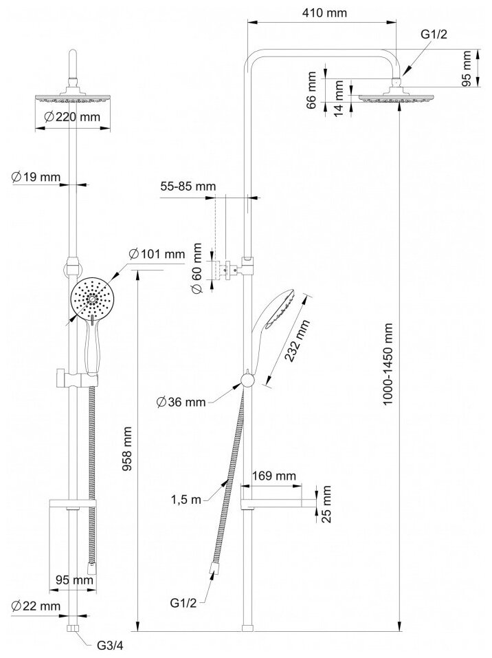 | Особенности | держатель душевой лейки / регулируемый верхний душ |