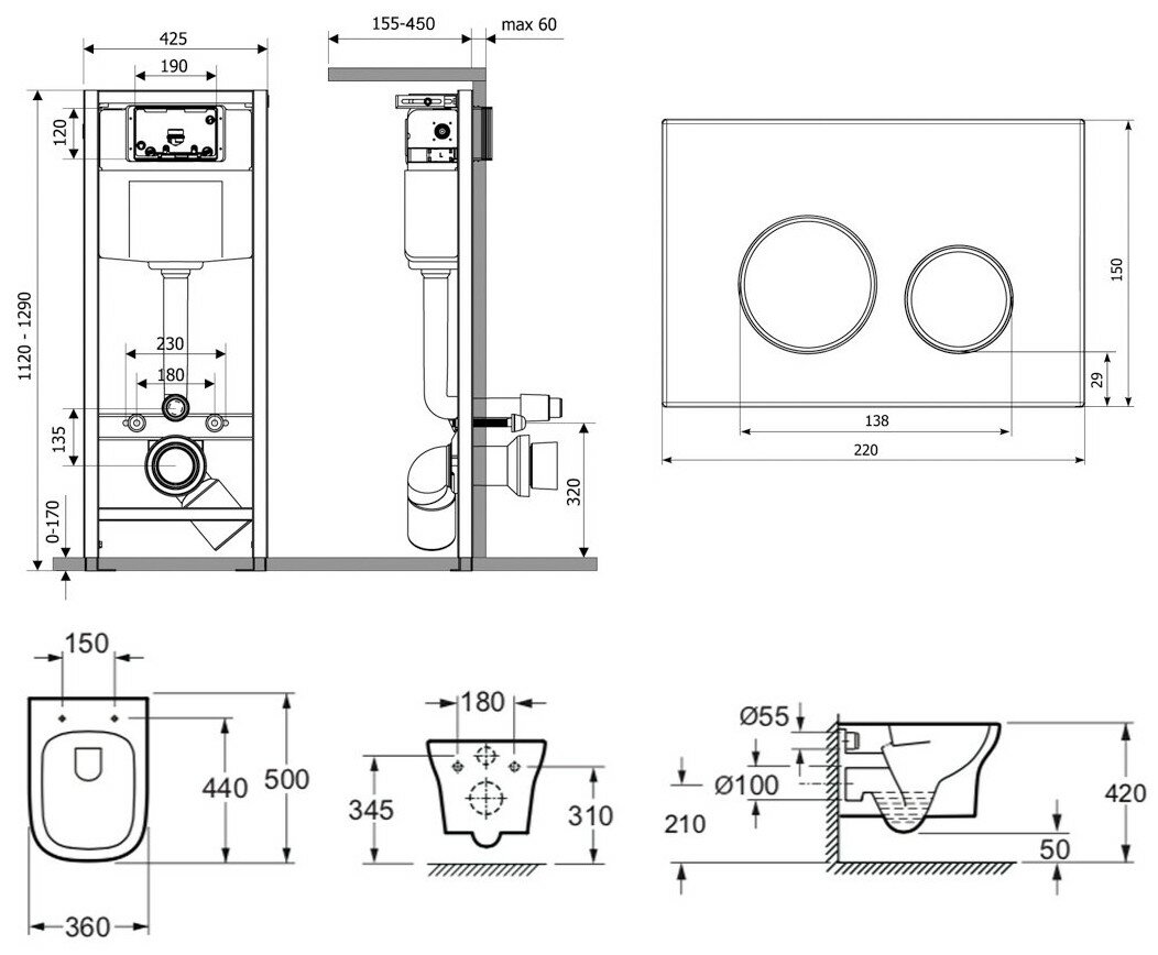 Подвесной унитаз комплект 6 в 1 Lavinia Boho Bristol Rimless 77050201: унитаз, сиденье микролифт, инсталляция, кнопка, шумоизоляция