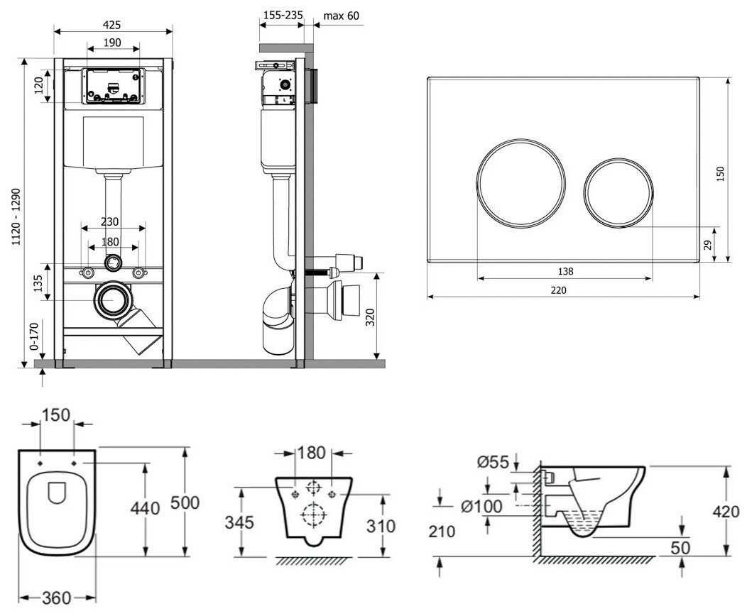 Подвесной унитаз комплект 6 в 1 Lavinia Boho Bristol Rimless 75110220: унитаз, сиденье микролифт, инсталляция, кнопка, шумоизоляция