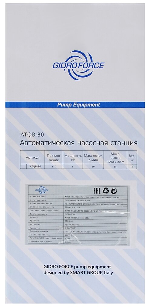 | Подробная комплектация | насосная станция GIDROFORCE ATQB80 с расширительным баком, руководство по эксплуатации, гарантийный талон |
