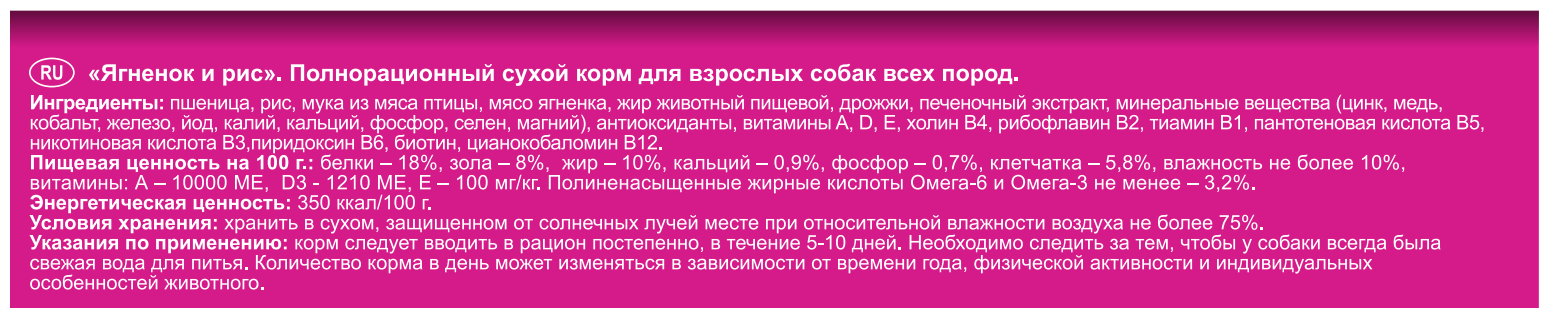 | Состав | пшеница, рис, мука из мяса птицы, мясо ягненка, куриный жир очищенный, дрожжи, печеночный экстракт, минеральные вещества, антиоксиданты, витамины А, Д3, Е, холин В4, рибофлавин В2, тиамин В1, пантотеновая кислота В5, никотиновая кислота В3, пиридоксин В6, биотин, цианокобаломин В12 |