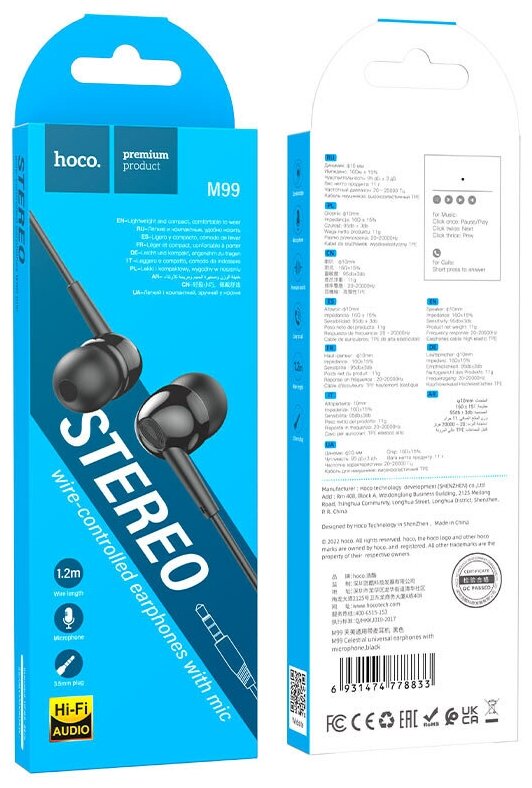 Проводные внутриканальные наушники с микрофоном HOCO M99 Celestial, , аудиоразъем 3,5 мм, стерео гарнитура, черный