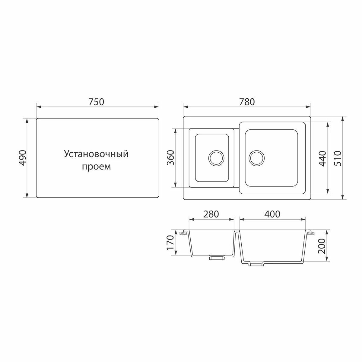 Мойка для кухни GreenStone GRS-76K-343, врезная, 780 x 510 мм, антрацит