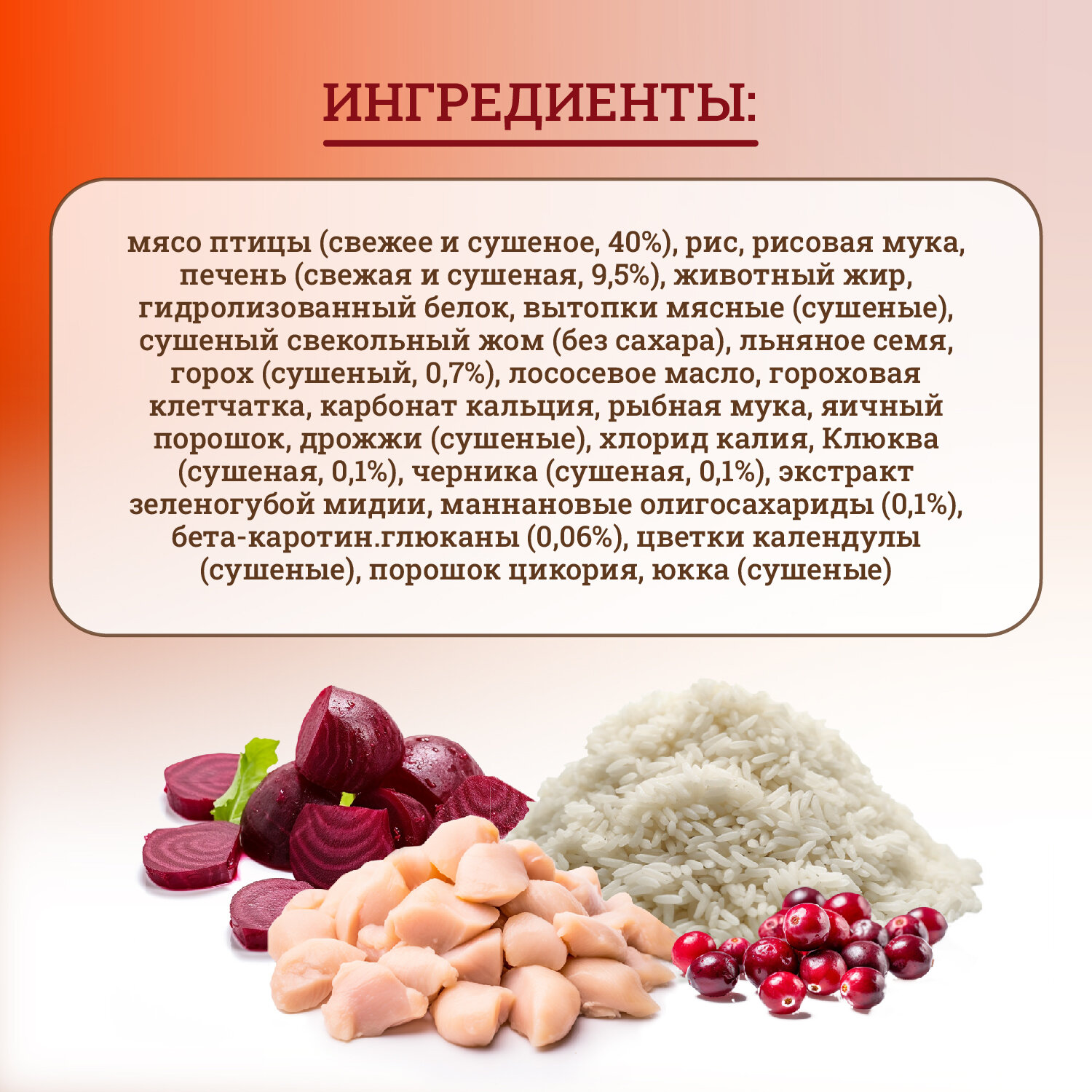 | Состав | мясо птицы (свежее и сушеное, 40 %), рис, рисовая мука, печень (свежая и сушеная, 9,5 %), животный жир, гидролизованный белок, вытопки мясные (сушеные), сушеный свекольный жом (без сахара), льняное семя, горох (сушеный, 0,7 %), лососевое масло, гороховая клетчатка, карбонат кальция, рыбная мука, яичный порошок, дрожжи (сушеные), хлорид калия, Клюква (сушеная, 0,1 %), черника (сушеная, 0,1 %), экстракт зеленогубой мидии, маннановые олигосахариды (0,1 %), бета-каротин.глюканы (0,06 %), цветки календулы (сушеные), порошок цикория, юкка (сушеные) |