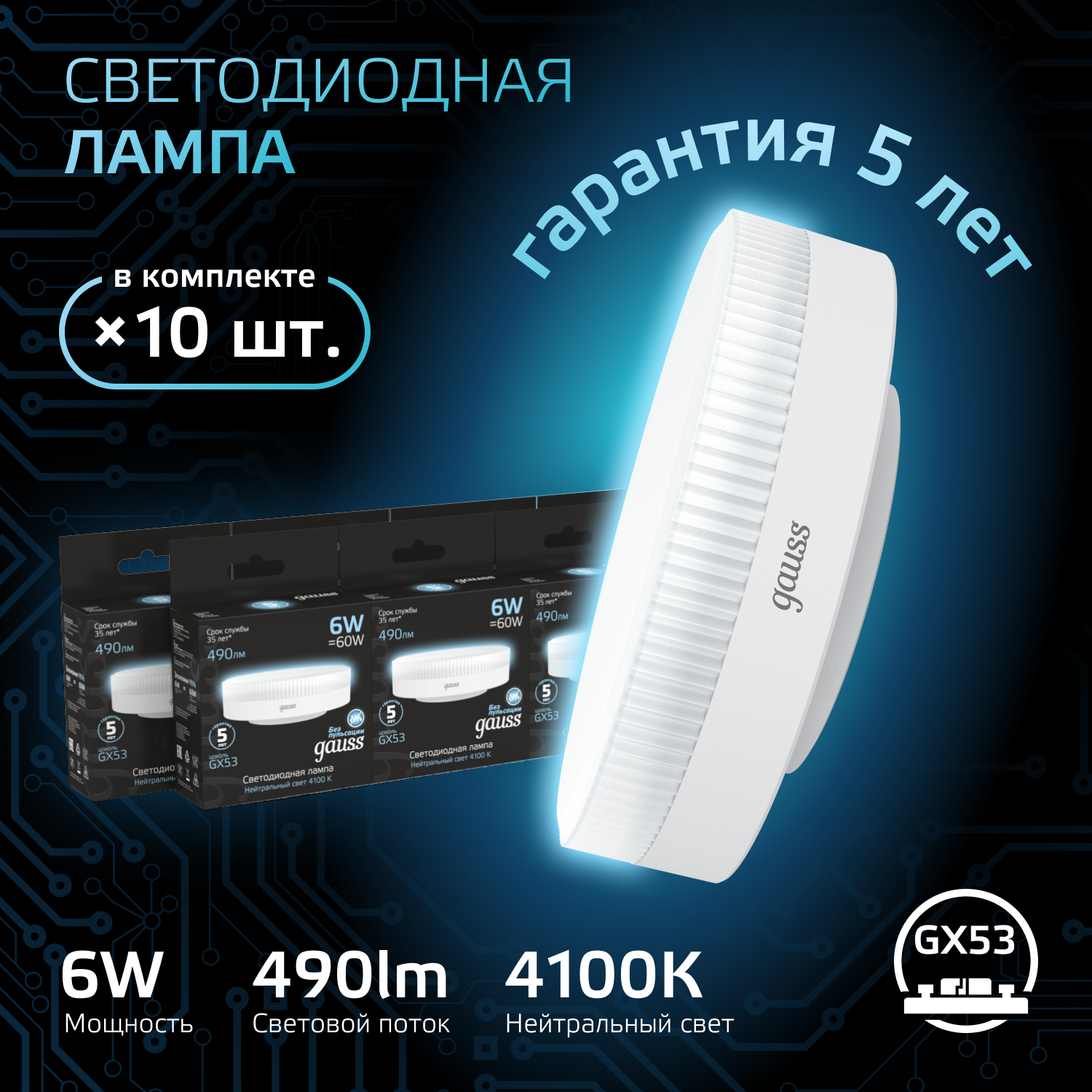 Купить Лампочка светодиодная GX53 6W нейтр-белый свет 4100K 490lm упаковка 10 штук Gauss