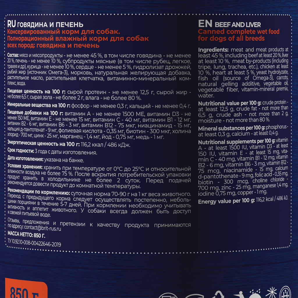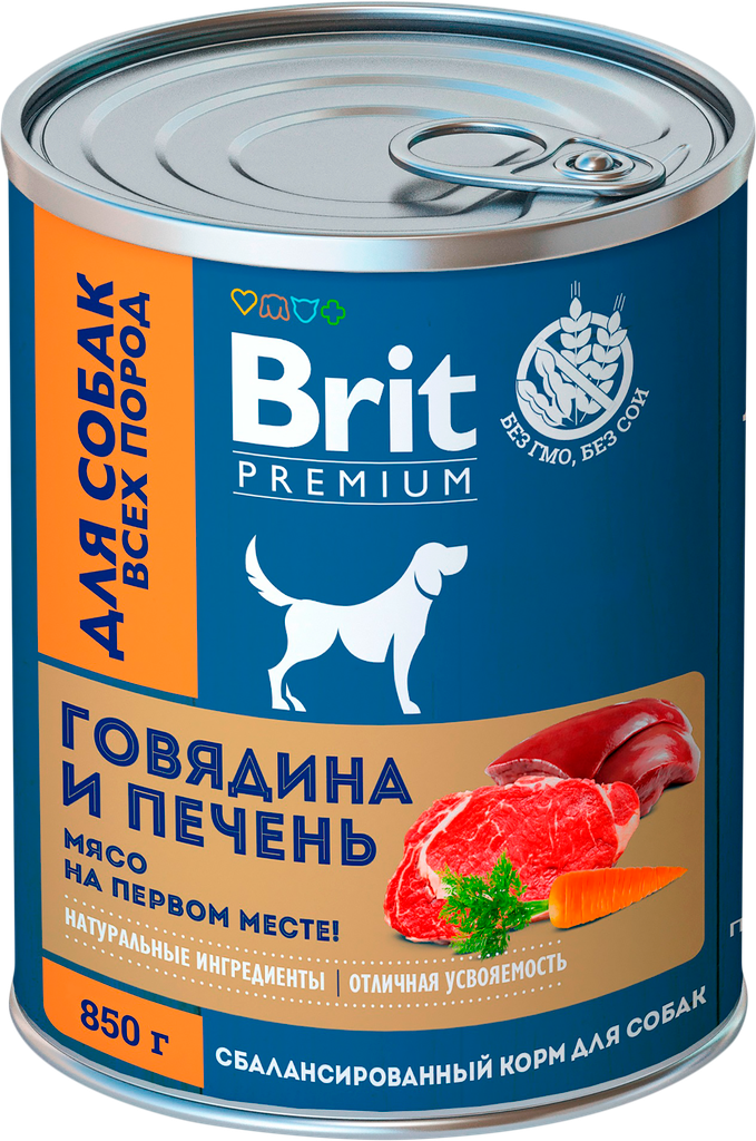 Влажный корм Brit с говядиной-печенью повседневный для собак 850 г