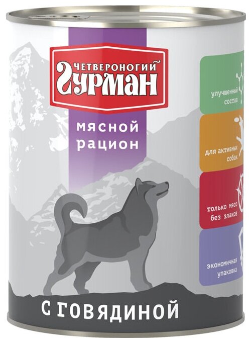 Консервы четвероногий гурман мясной рацион для взрослых собак с говядиной 850гр х 6шт интересное: