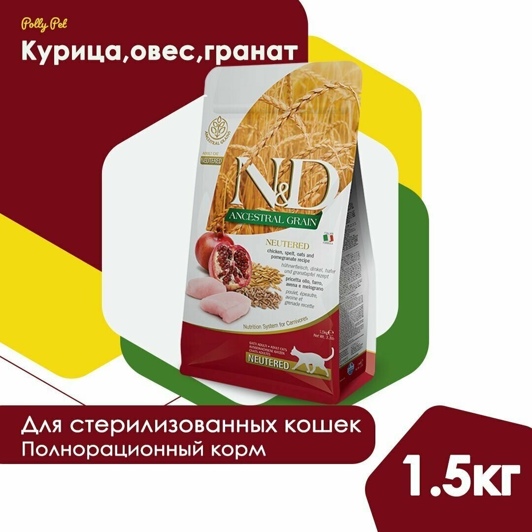 Сухой корм Farmina N&D Ancestral Grain для стерилизованных кошек, рацион со вкусом курицы, граната и овса, 1,5кг