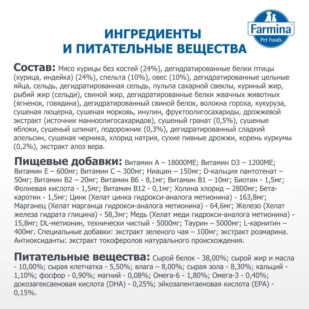 | Состав | Свежее куриное филе (24%), дегидратированное куриное мясо (24%), спельта (10%), овес (10%), дегидратированные цельные яйца, свежая сельдь, дегидратированная сельдь, гидролизат животного белка, пульпа сахарной свеклы, куриный жир, рыбий жир, волокна гороха, сушеная люцерна, сушеная морковь, инулин, фруктоолигосахариды, маннанолигосахариды, порошок граната (0,5%), сушеные яблоки, порошок шпината, подорожник (0,3%), порошок черной смородины, дегидратированный сладкий апельсин, порошок черники, хлорид натрия , сухие пивные дрожжи, корень куркумы (0,2%), глюкозамин, хондроитинсульфат, экстракт календулы (источник лютеина). |