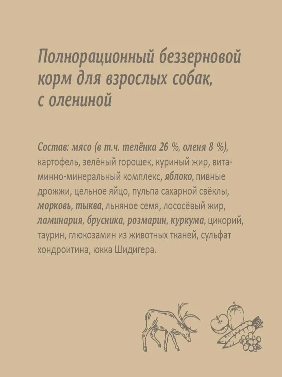 | Состав | мясо (в т.ч телёнка 26%, оленя 8%), картофель, зелёный горошек, куриный жир, витаминно-минеральный комплекс, яблоко, пивные дрожжи, цельное яйцо, пульпа сахарной свёклы, морковь, тыква, льняное семя, лососёвый жир, ламинария, брусника, куркума, розмарин, цикорий, таурин, глюкозамин из животных тканей, сульфат хондроитина, юкка Шидигера. |