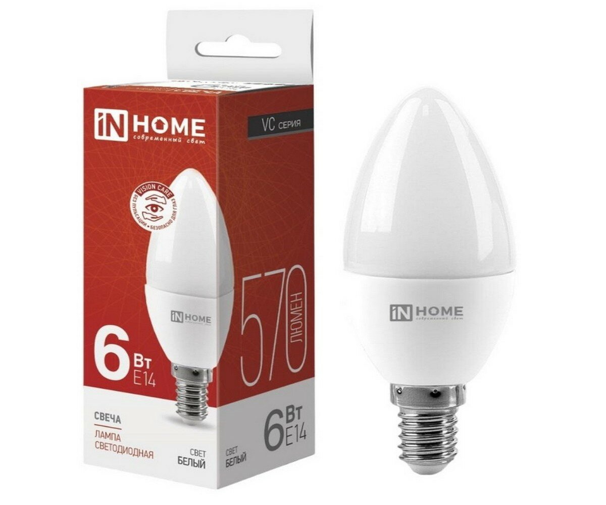 Лампа светодиодная IN HOME LED-СВЕЧА-VC, Е14, 6 Вт, 230 В, 4000 К, 570 Лм интересное: