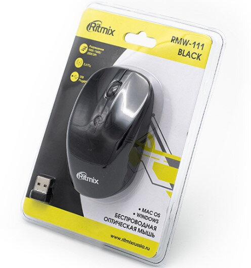 Мышь беспроводная оптическая RITMIX RMW-111, чёрная. Разрешение: 1000-2000 dpi. Кнопок: 3 + колесо кнопка. Радиус: 8-10 м. (1/100)