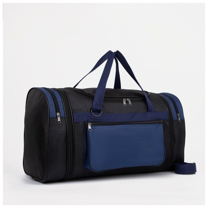 Сумка дорожная на молнии, с увеличением, 3 наружных кармана, длинный ремень, цвет чёрный/синий