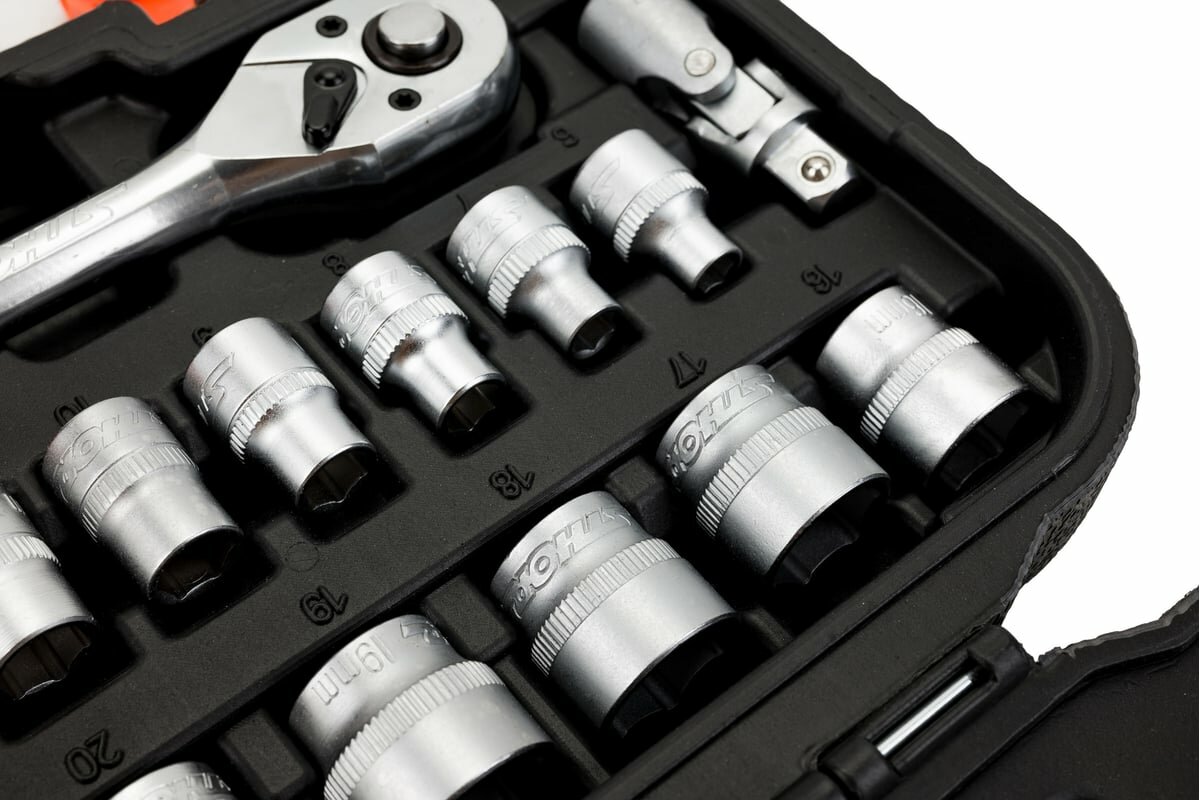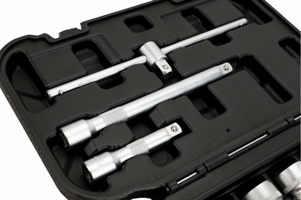 | Головки торцевые подробно | 3/8": 6, 7, 8, 9, 10, 11, 12, 13, 14, 15, 16, 17, 18, 19, 20, 21, 22 мм; удлинитель 3/8": 75, 150 мм; трещотка 3/8": 45 зубов; вороток т-образный 3/8": 200 мм |