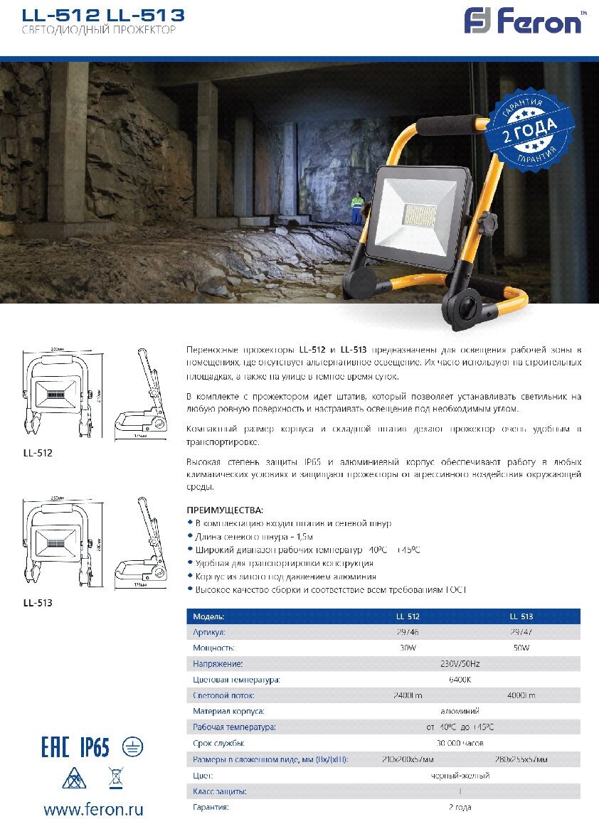Feron Прожектор светодиодный переносной LL-512 30W, 6400K, 2400Lm, IP65 29746 .