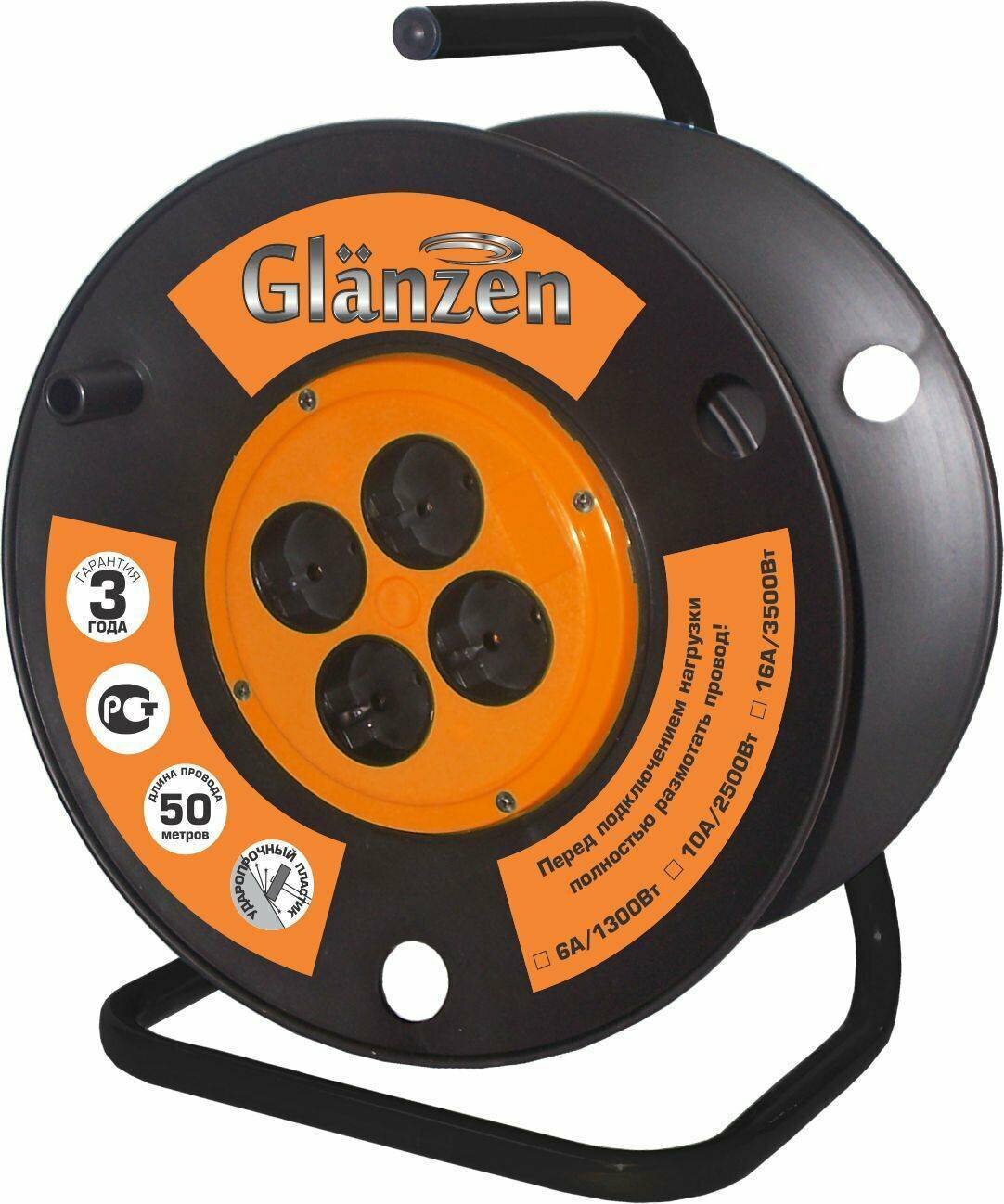 Удлинитель на катушке Glanzen EB-50-006, 4 розетки, б/з, 16А / 3500 Вт красный 50 м 1.5 м² 4