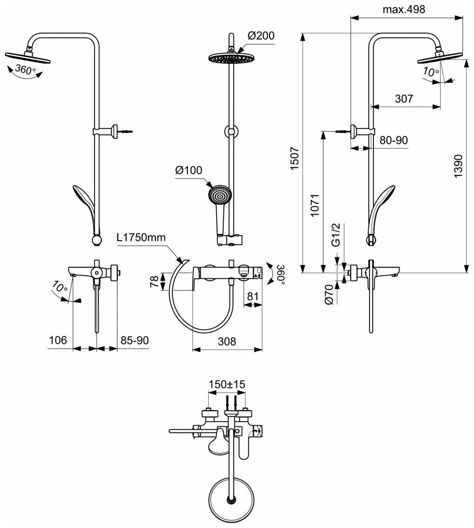 Душевая система в комплекте с настенным смесителем для ванны/душа Ideal Standard CERAFINE O BC749XG