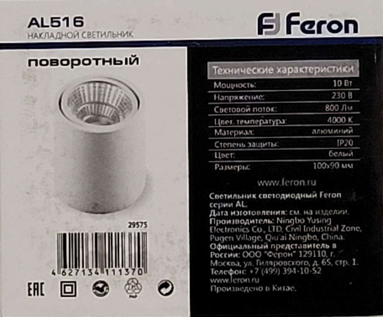 Светильник светодиодный 10W, 800Lm, 30 градусов, белый, поворотный, AL516, Feron, 29575