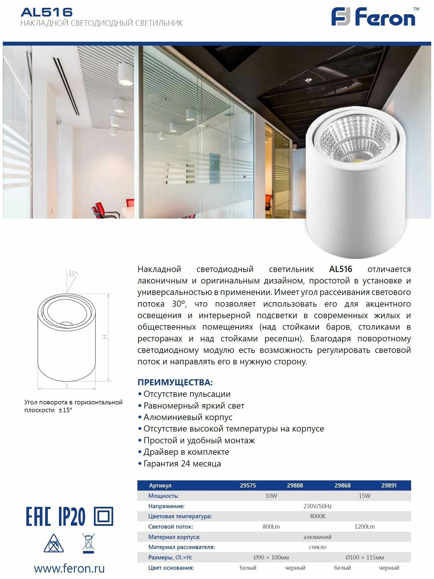 Светодиодный светильник Feron AL516 накладной 10W 4000K черный поворотный FERON 29888 (1 шт.)