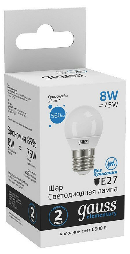 Купить Лампа светодиодная Elementary 8Вт P45 шар 6500К холод. бел. E27 560лм GAUSS 53238