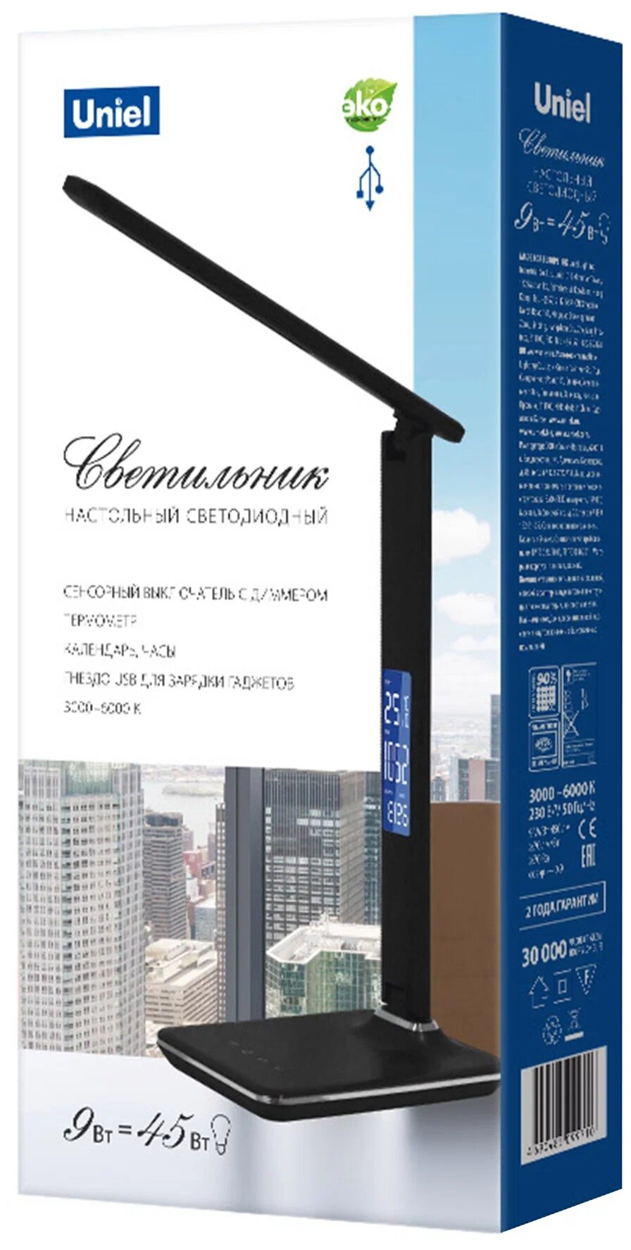 Настольная лампа Uniel TLD-551 Brown/LED/450Lm/3000-6000K/Dimmer/USB/часы/календарь/термометр/9W/коричневый (стилизован под кожу)
