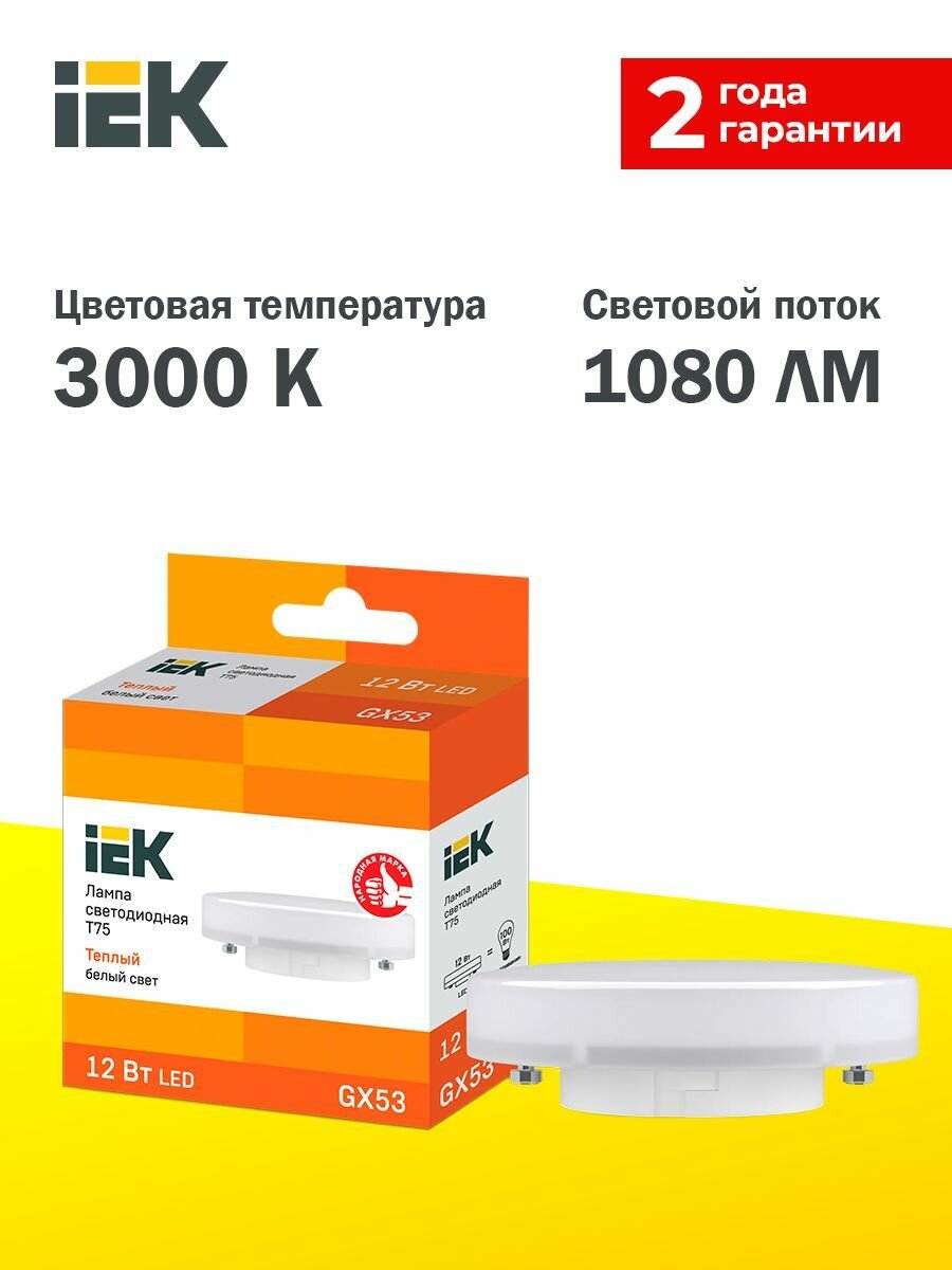 Купить Лампа светодиодная GX53, 12 Вт, 75 Вт, 230 В, таблетка, 3000 К, свет теплый белый, IEK, T75, LED