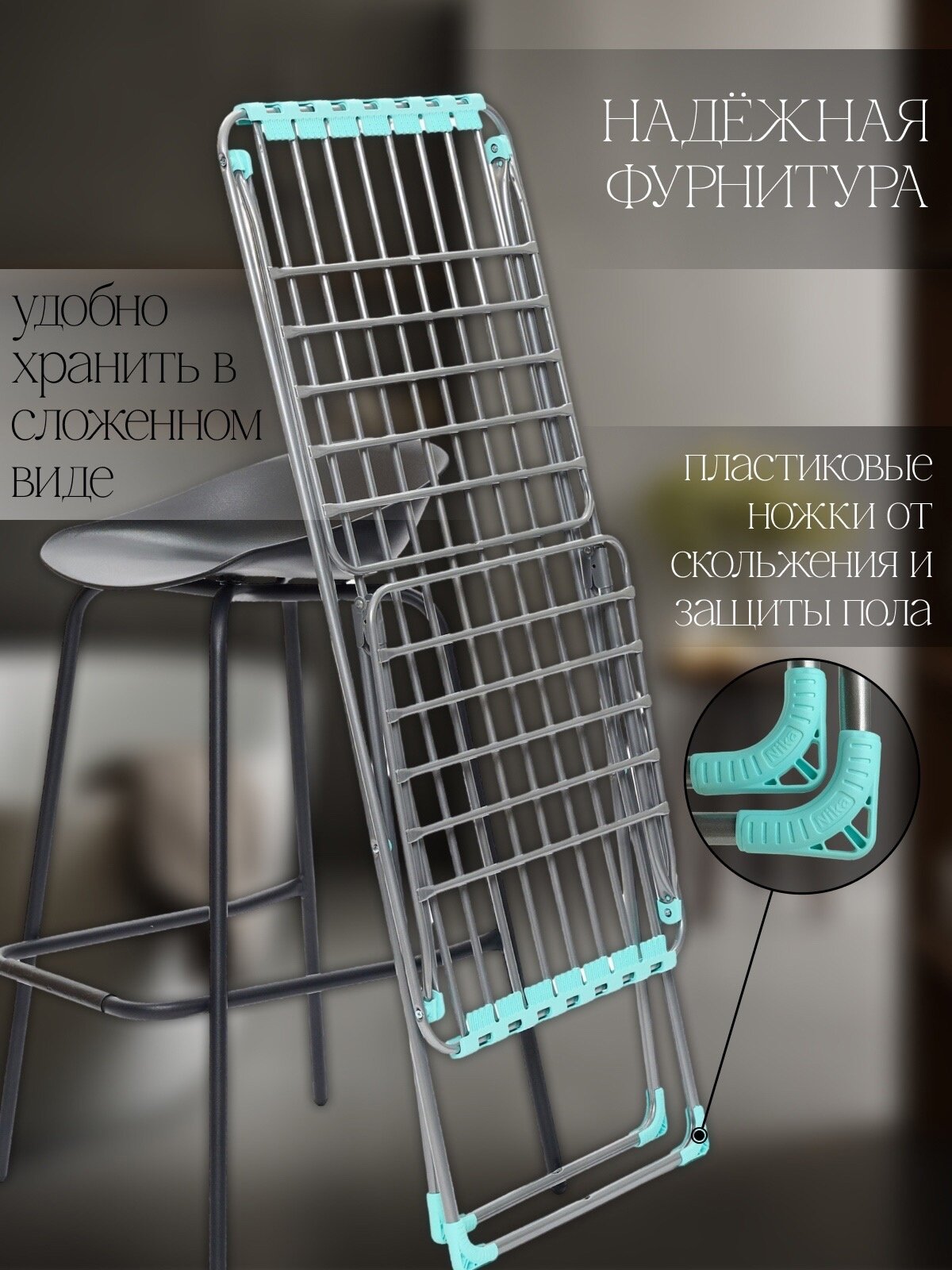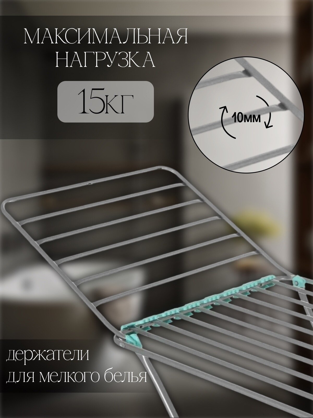Сушилка для белья напольная складная, серебряный, 3 зоны, до 15 кг. Пластмассовые наконечники на струнах обеспечивают дополнительную устойчивость и предотвращают скольжение белья