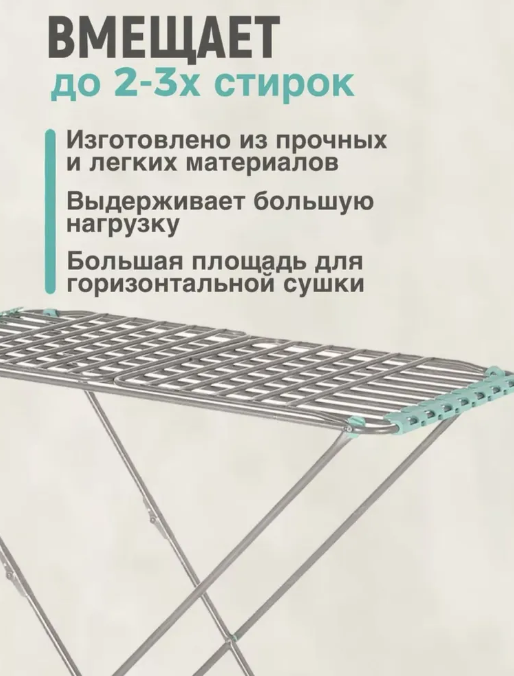 | Плюсы: | высокая, можно вешать длинное белье, удобно раскладывается, я довольна! |