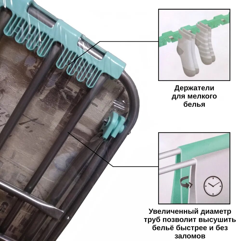 С одной стороны у ножек даже есть колёсики. Удобные крюки для сушки обуви и маленькие крючки для нижнего белья. Классная съемная секция которую можно переместить на батарею если сушилка не помещается в длину или нужно просто быстрее высушить на горячей батарее какие-то вещи. |