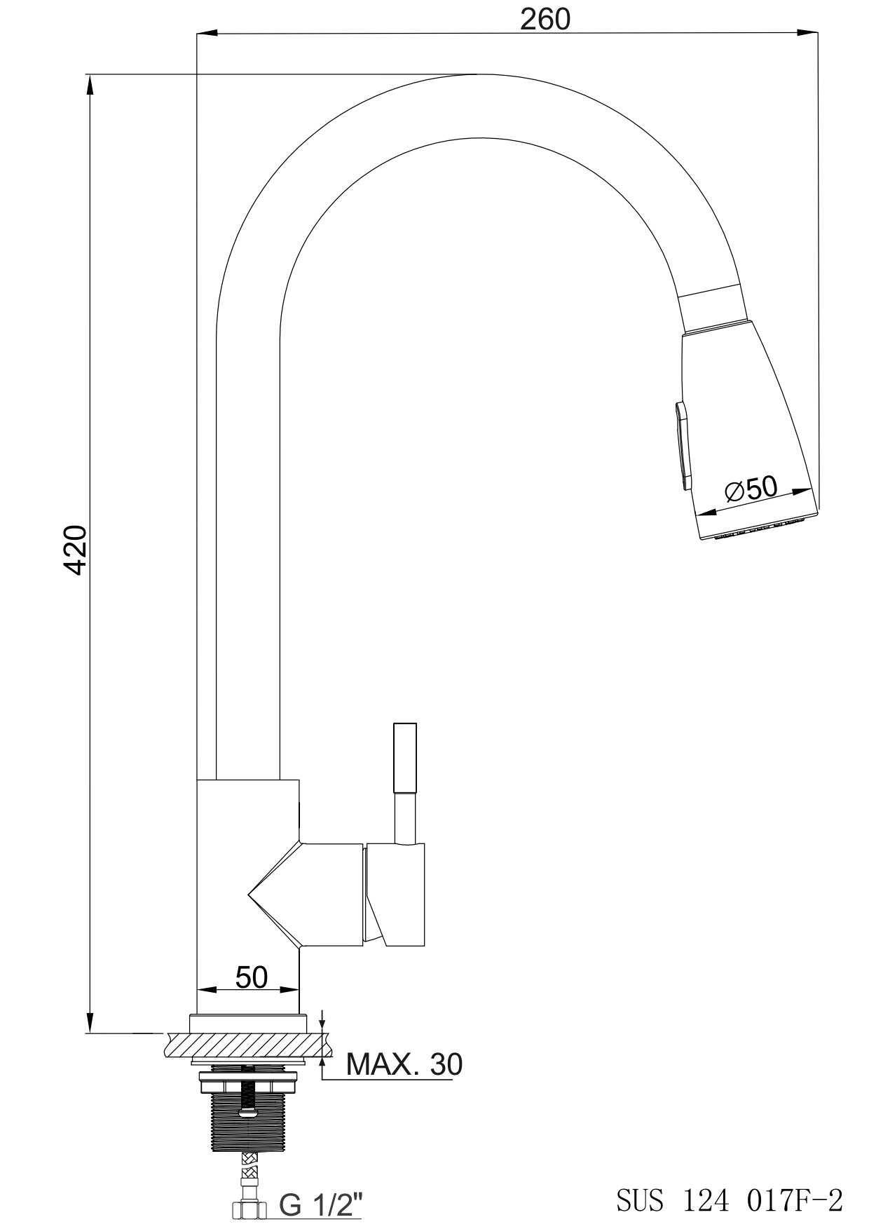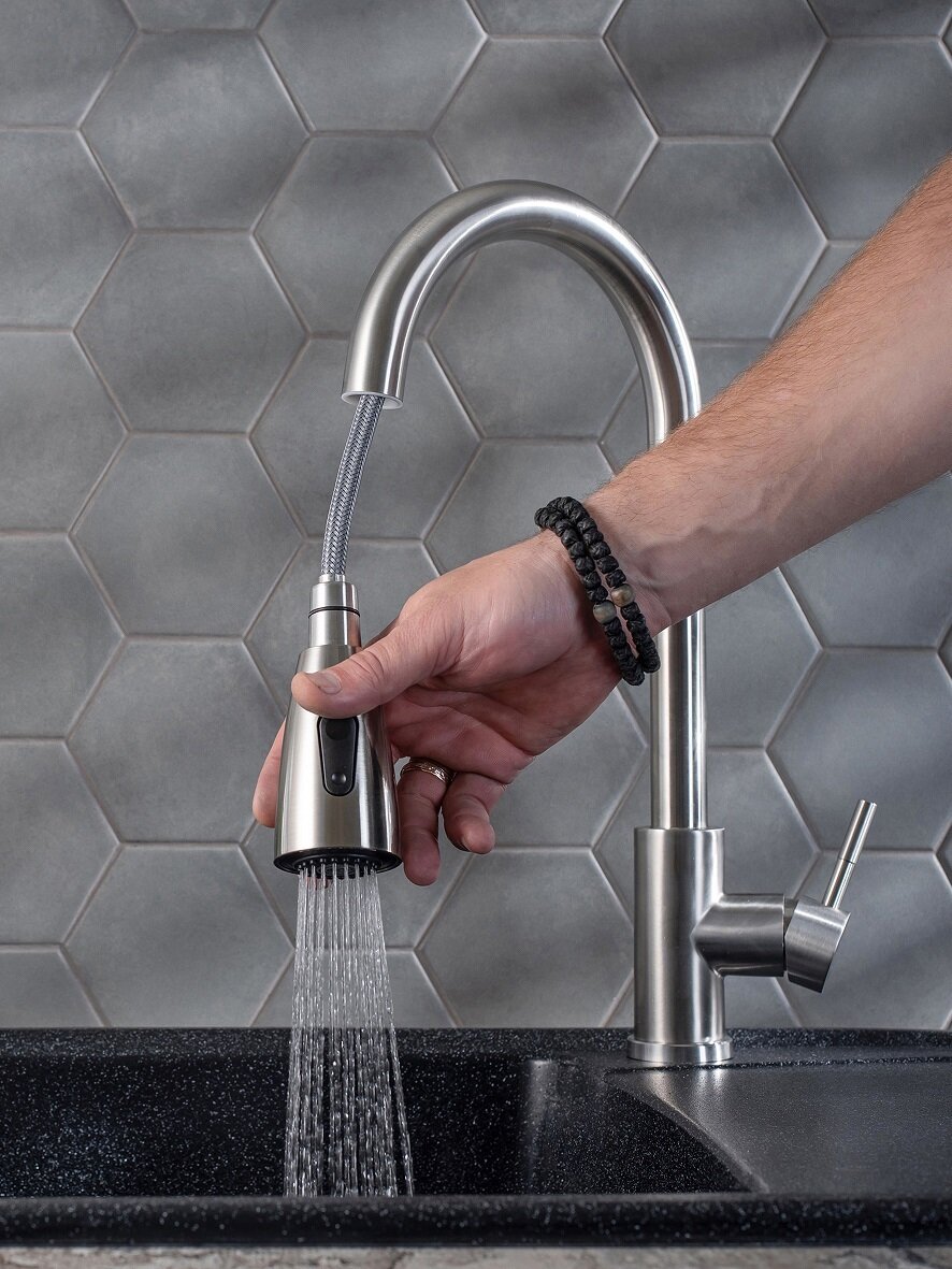 Смеситель для кухни, РМС SUS124-017F-2, выдвижной излив, нержавеющая сталь, режим душ