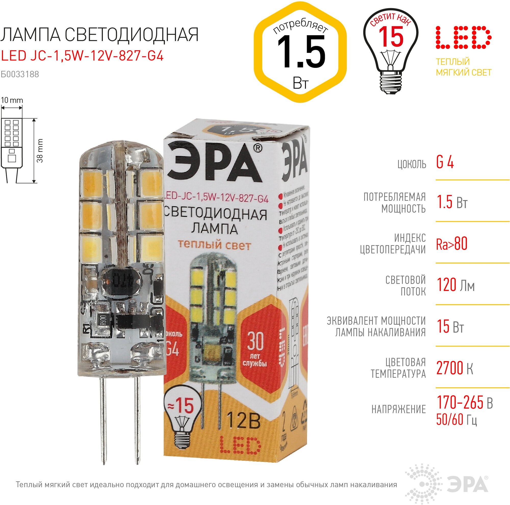 Купить Лампа светодиодная ЭРА Б0033188, G4, JC, 1.5 Вт, 2700 К