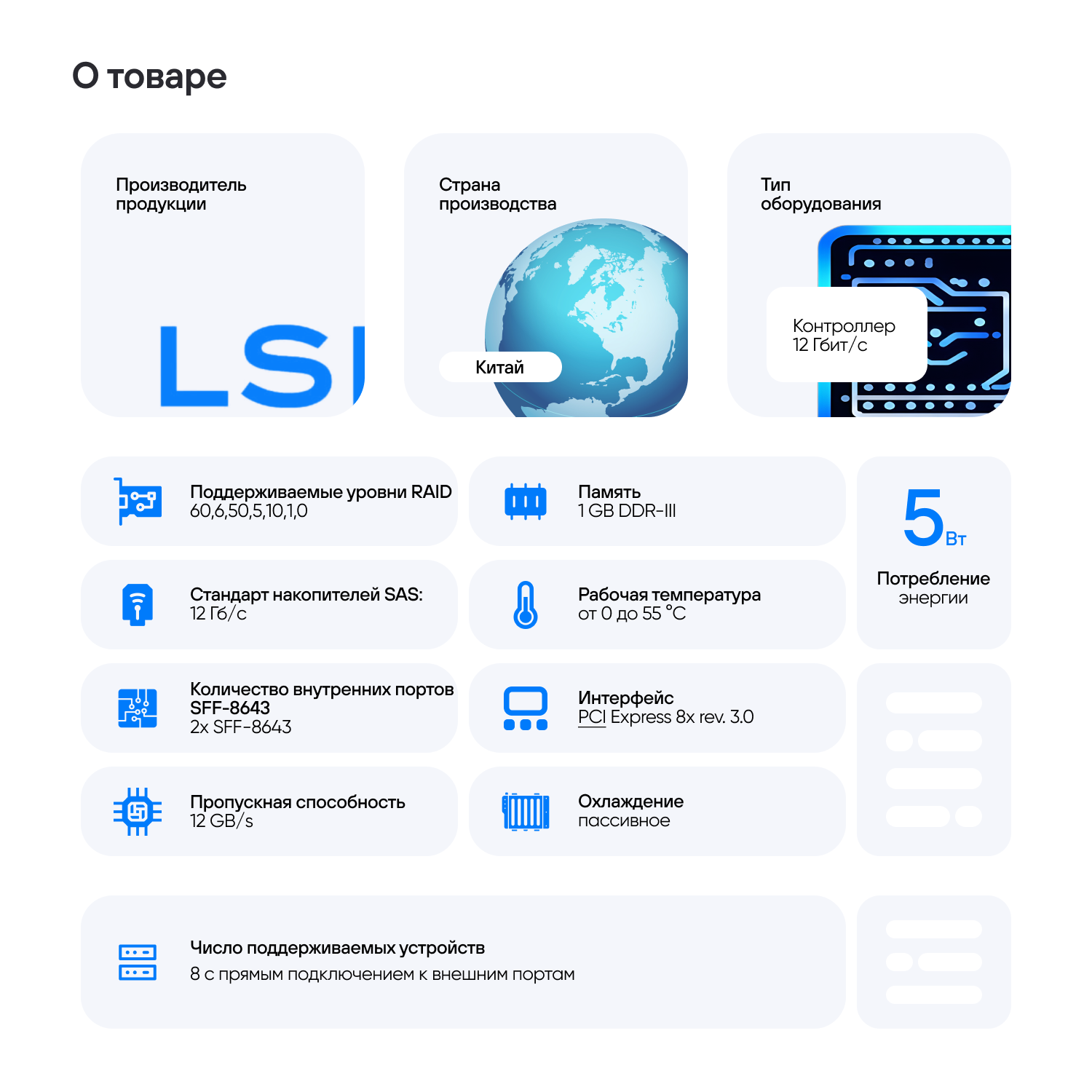 Плата контроллера RAID-массива LSI MegaRAID SAS 9361-8i, 12Gb/s, SAS/SATA 8-port int, RAID 0/1/5/6/10/50/60, Cache 1Gb DDR3 (LSI00417)
