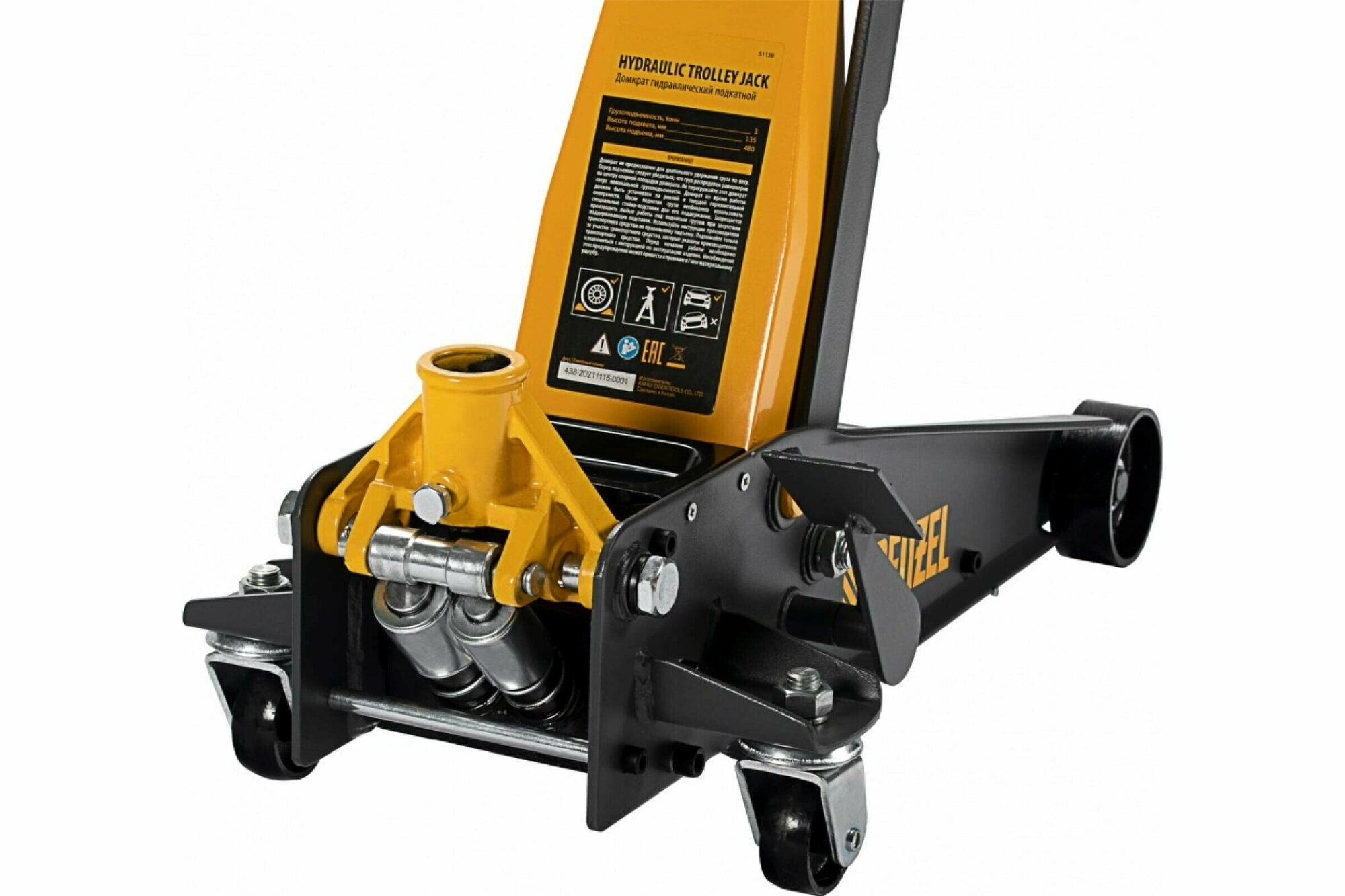 Домкрат гидравлический подкатной Denzel 51138, 3 т, с фиксатором, быстрый подъем, 135-480 мм, профессиональный