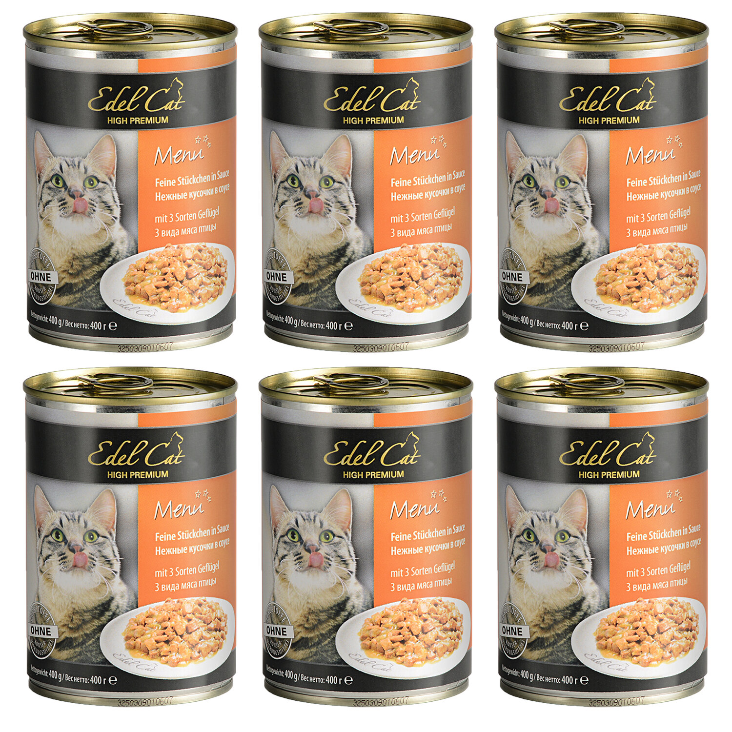 Влажный корм для кошек Edel Cat консервы нежные кусочки в соусе 3 вида мяса птицы 0,4кг (12 шт)