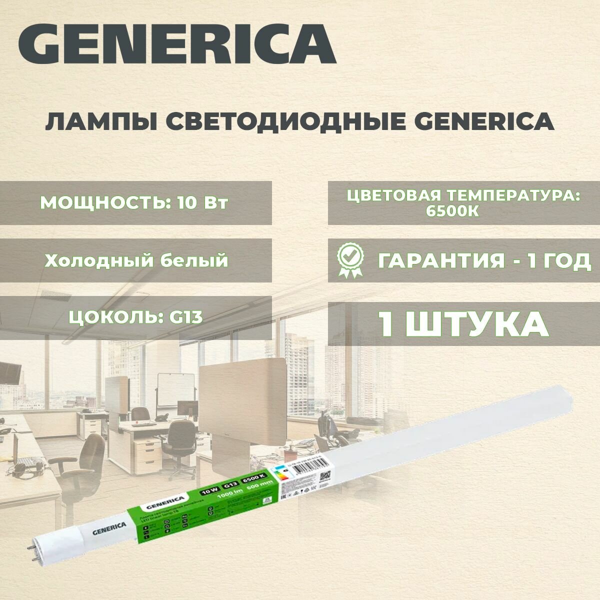 Купить GENERICA Лампа светодиодная GENERICA, 10 Вт, T8, линейная, 600 мм, 6500 К, G13, 230 В, LL-T8-10-230-65-G13-G