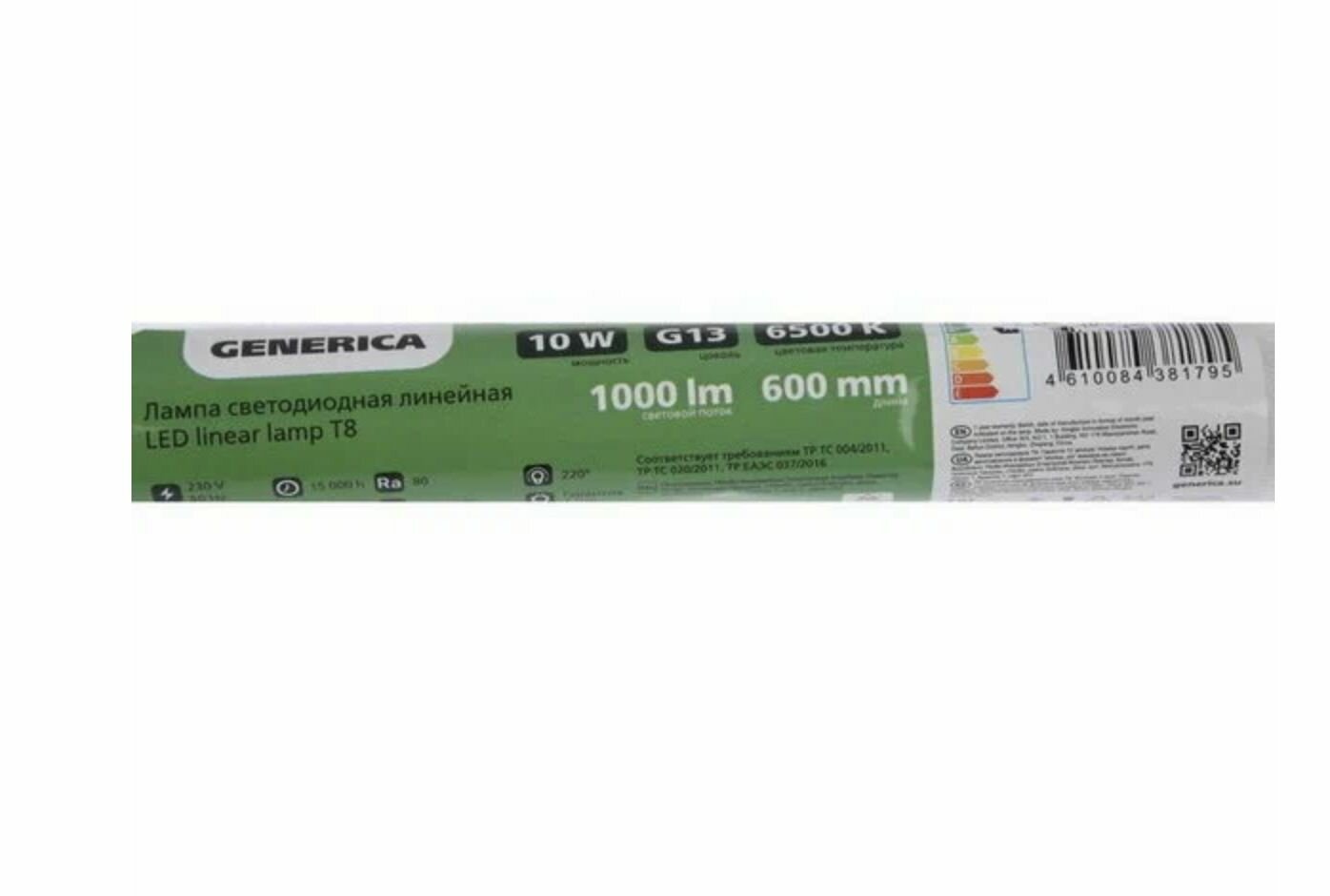 GENERICA Лампа светодиодная GENERICA, 10 Вт, T8, линейная, 600 мм, 6500 К, G13, 230 В, LL-T8-10-230-65-G13-G интересное: