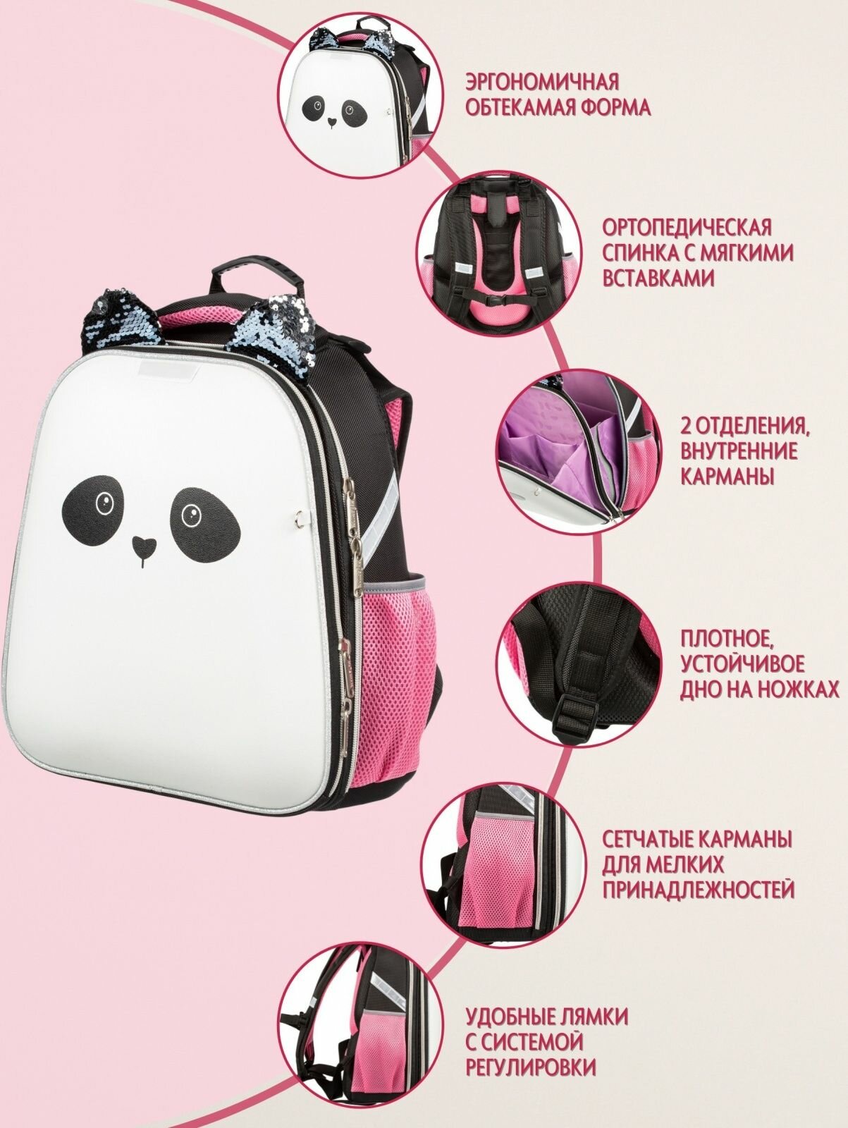 Ранец №1 School анатомический Panda (экокожа, пайетки двусторонние), 1485076