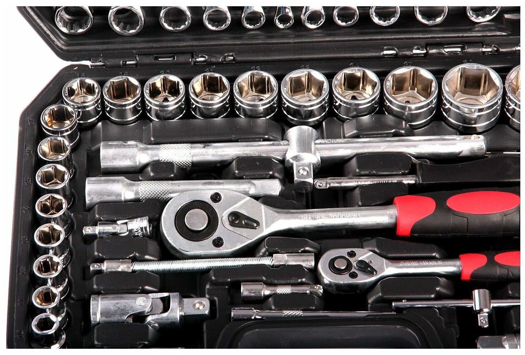 | Дополнительная информация | трещотка 1/4" - 1 шт., 1/2" - 1 шт.; вороток 1/4" с отвёрточной рукояткой - 1 шт.; скользящий вороток 1/4" - 1 шт.; вороток комбинированный (удлинение и скольжение) 1/2": удлинение 250мм - 1 шт.; вороток-удлинитель 1/4": 50мм - 1 шт., 100мм - 1 шт.; вороток-удлинитель 1/2": 125мм - 1 шт.; вороток-удлинитель гибкий 1/4": 150мм - 1 шт.; карданный шарнир: 1/4" - 1 шт., 1/2" 1 шт. |
