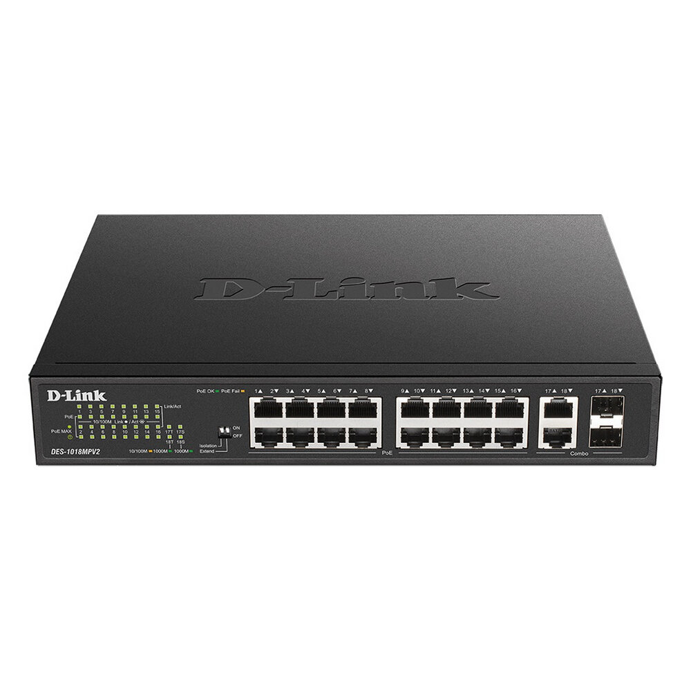 Коммутатор D-Link (DES-1018MPV2/A1A) Неуправляемый, 16 ports 10/100Base-TX, 2 combo-ports 100/1000Base-T/SFP, PoE-бюджет 246,4 Вт