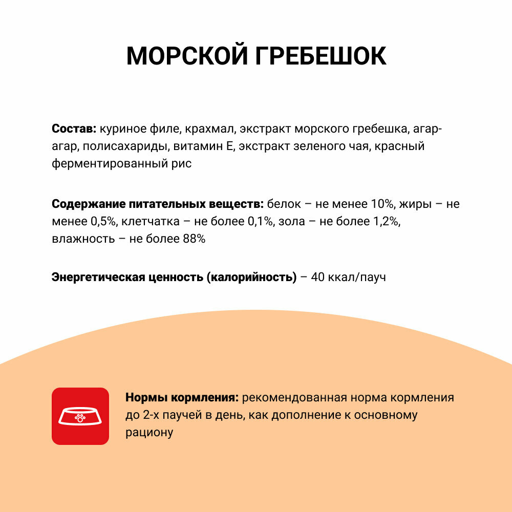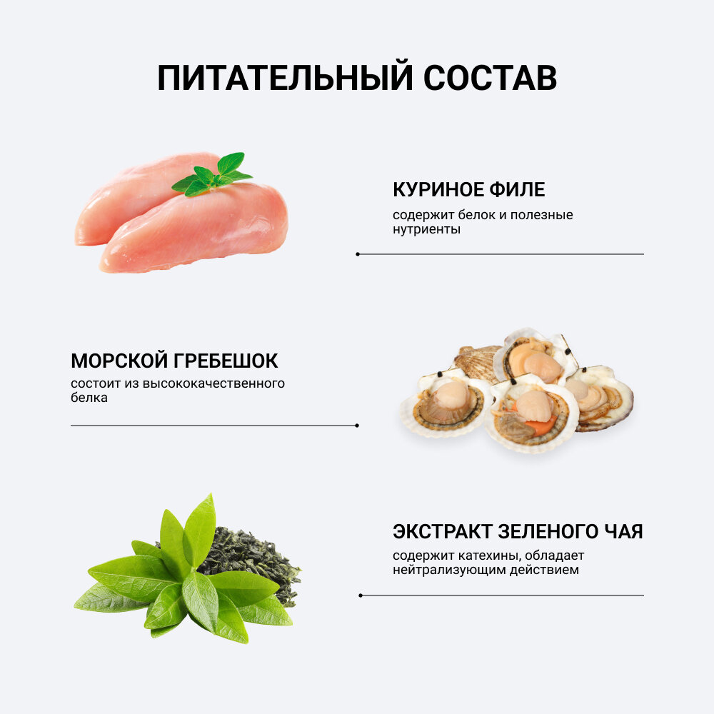 | Состав | куриное филе, крахмал, экстракт морского гребешка, агар-агар, полисахариды, витамин Е, экстракт зеленого чая, красный ферментированный рис |
