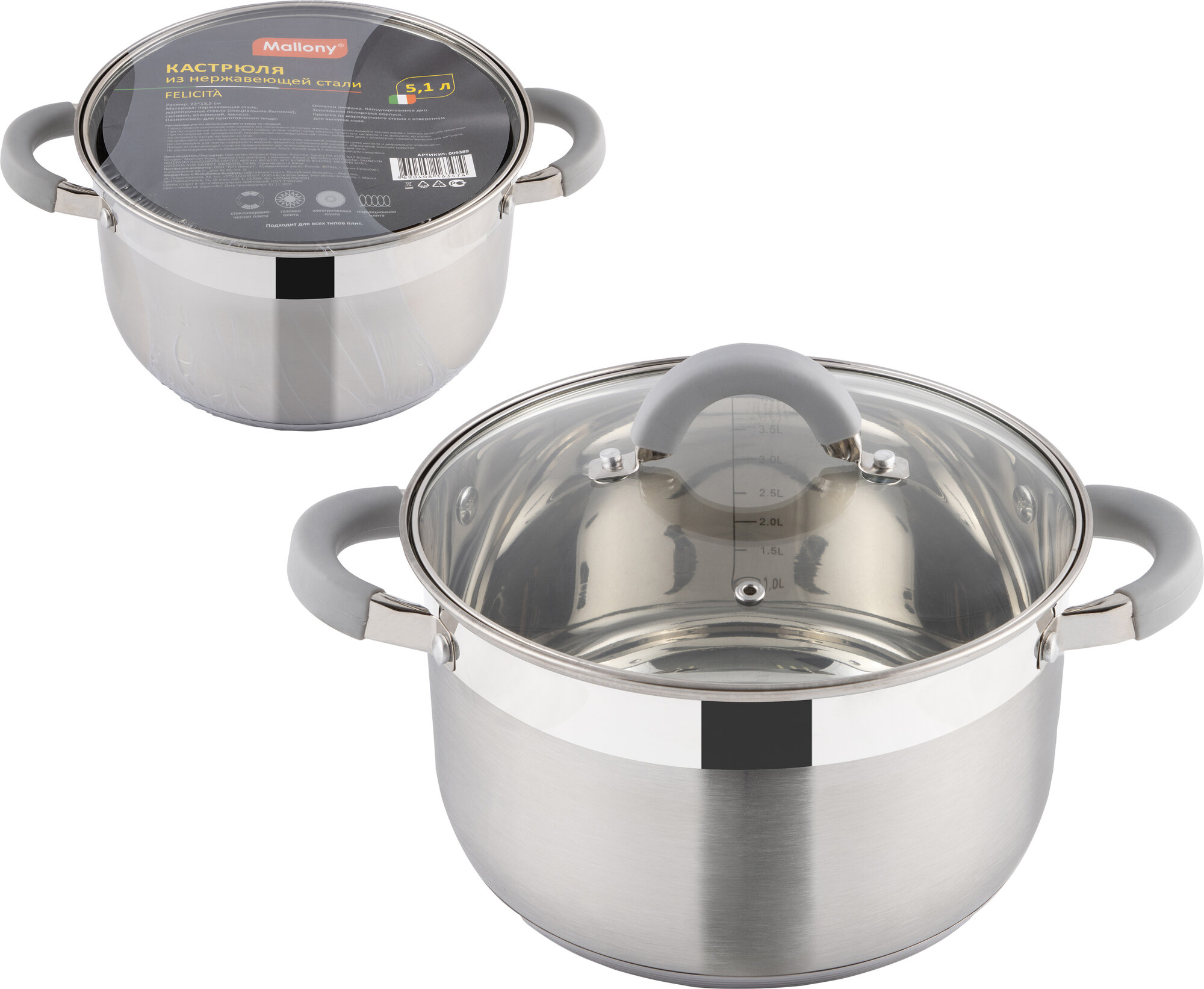 Кастрюля Mallony Felicità из нерж стали с крышкой из жаропроч стекла 5,1л