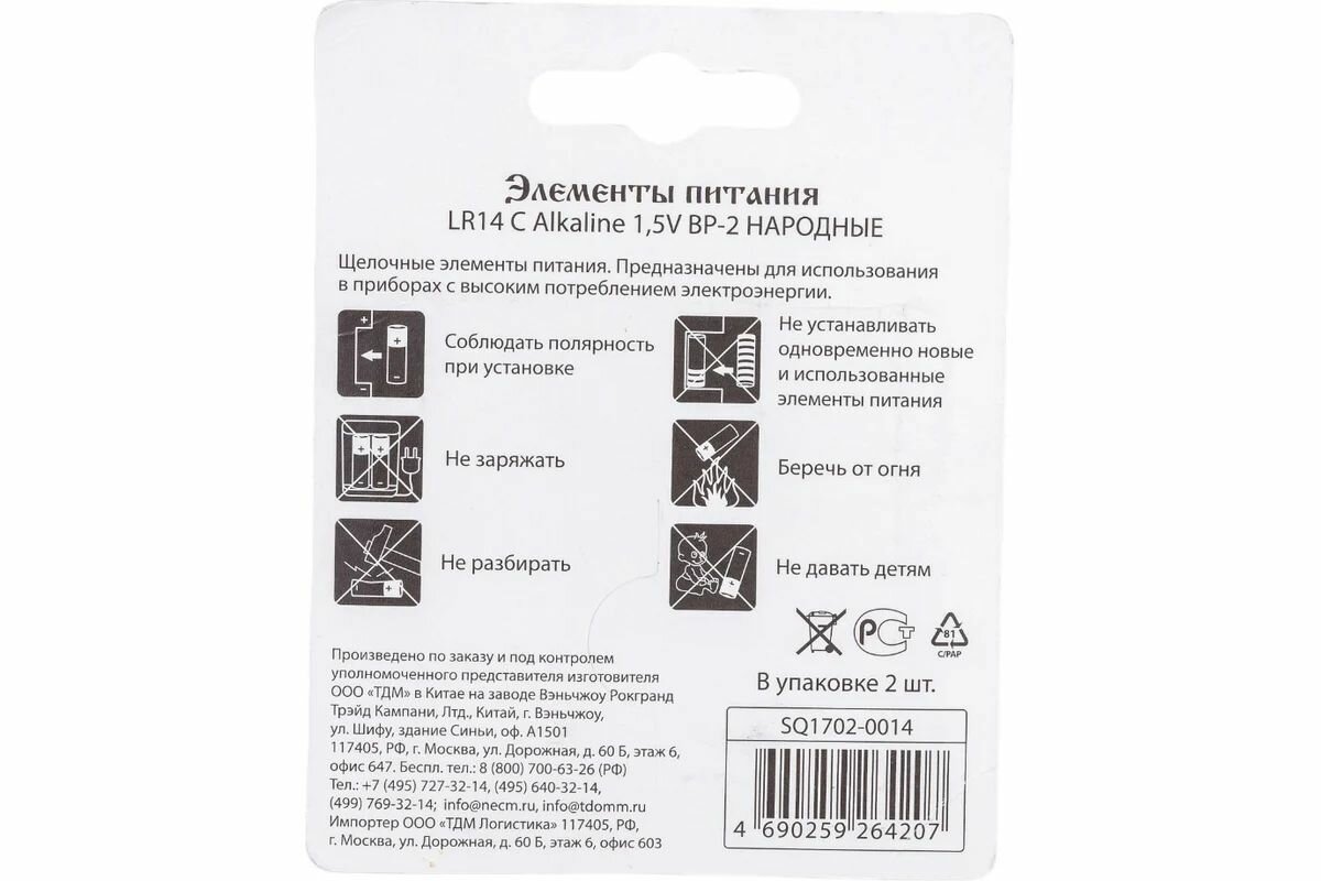 Батарейка TDM Electric, C (LR14), Народный, щелочная, 1.5 В, блистер, 2 шт, BP, SQ1702-0014/