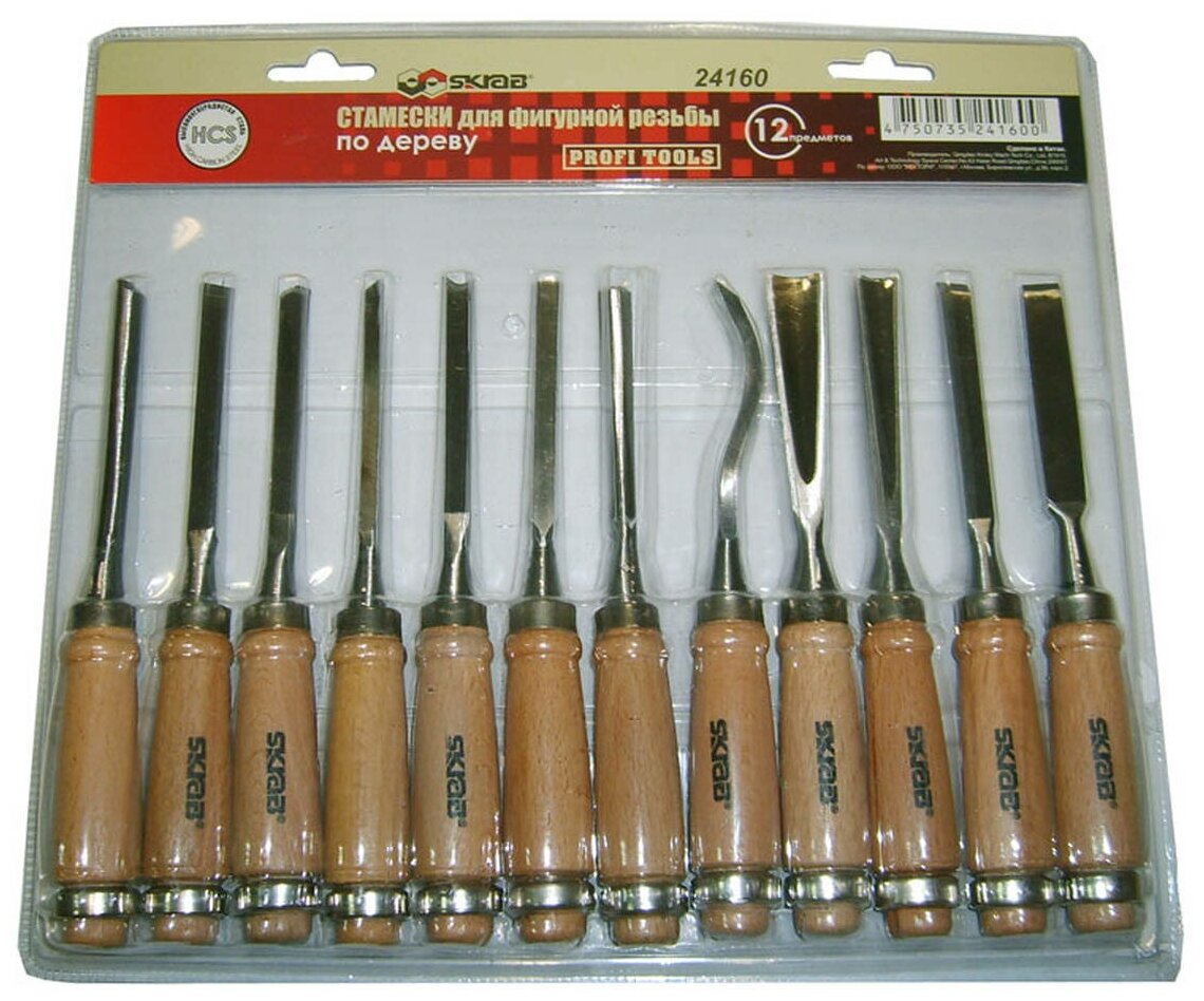 Стамески по дереву набор 12 предметов с деревянной ручкой SKRAB 24160