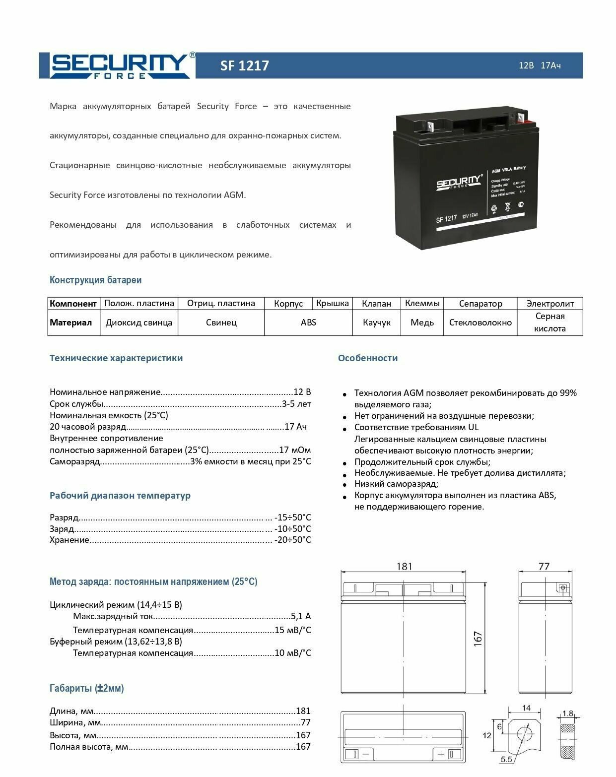 Аккумулятор Security Force 12 В, 17 Ач SF 1217 герметичный свинцово-кислотный