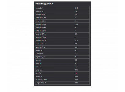 | Витамины | А, D3, Е, холина хлорид, бетаин, В3, В5, В2, В1, В6, фолиевая кислота, В12, калий, цинк, железо, марганец, медь, йод, селен |