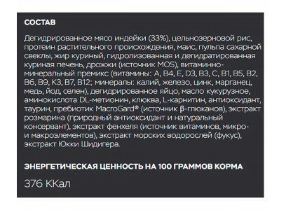 | Состав | дегидрированное мясо индейки (33%), цельнозерновой рис, протеин растительного происхождения, ячмень, жир куриный, пульпа сахарной свеклы, гидролизованная и дегидратированная куриная печень, витаминно-минеральный премикс, дрожжи (источник MOS), семена льна, дегидрированное яйцо, аминокислота DL-метионин, антиоксиданты, таурин, глюкозамина гидрохлорид, хондроитина сульфат, пребиотик MacroGard (источник β-глюканов), экстракт розмарина (природный антиоксидант и натуральный консервант), экстракт фенхеля (источник витаминов, микро- и макроэлементов), экстракт морских водорослей (фукус), экстракт юкки Шидигера |