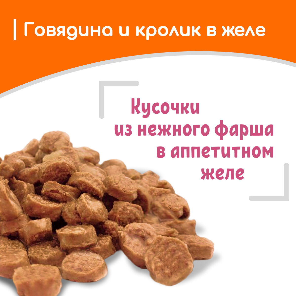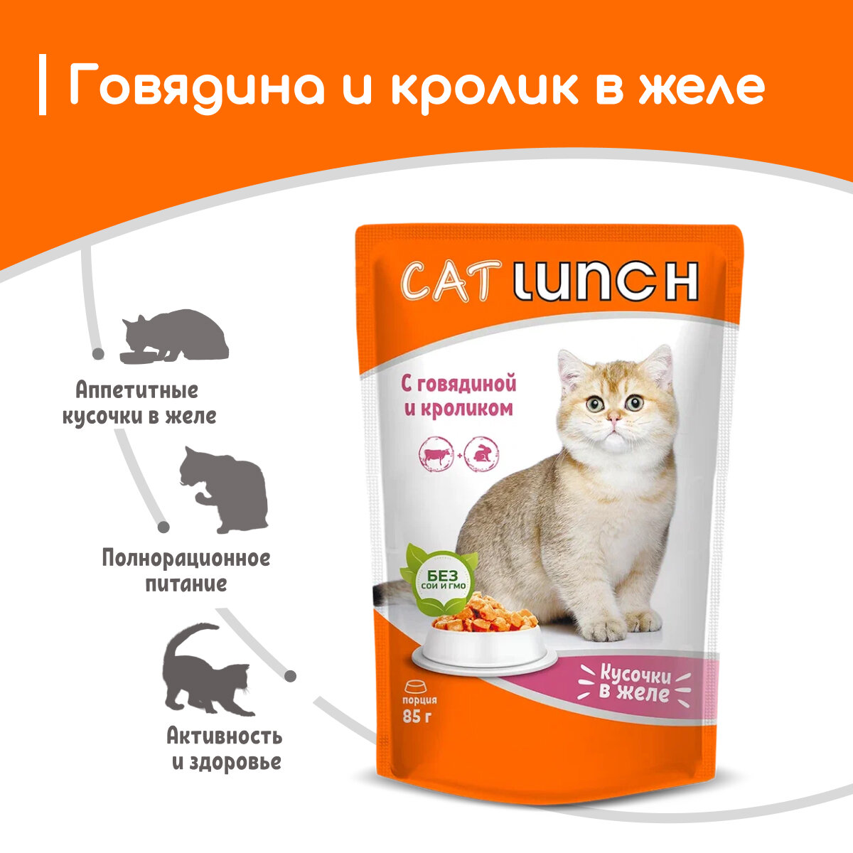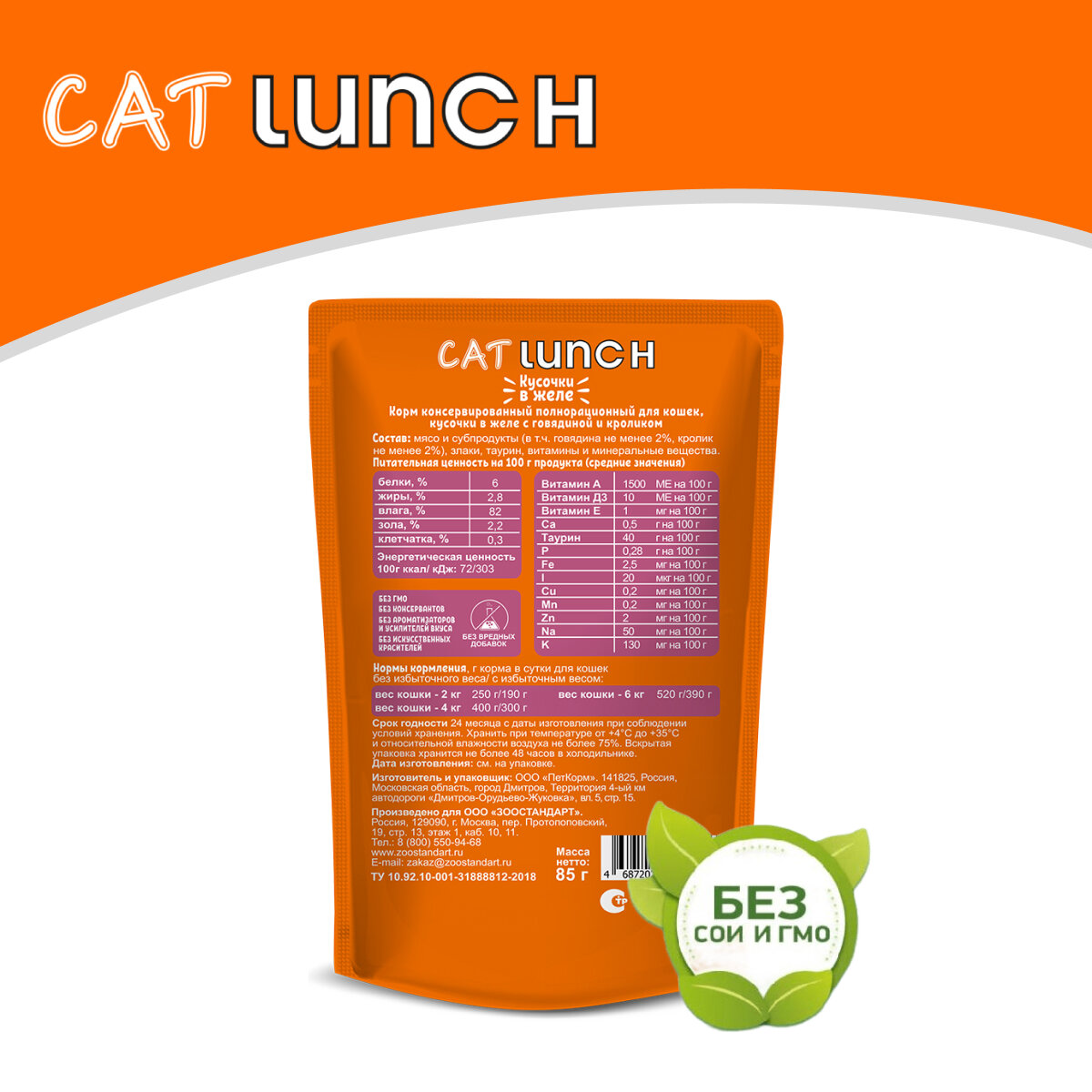 Влажный корм для кошек Cat Lunch кусочки в желе Говядина и Кролик, паучи по 85г (24 шт. в упаковке)