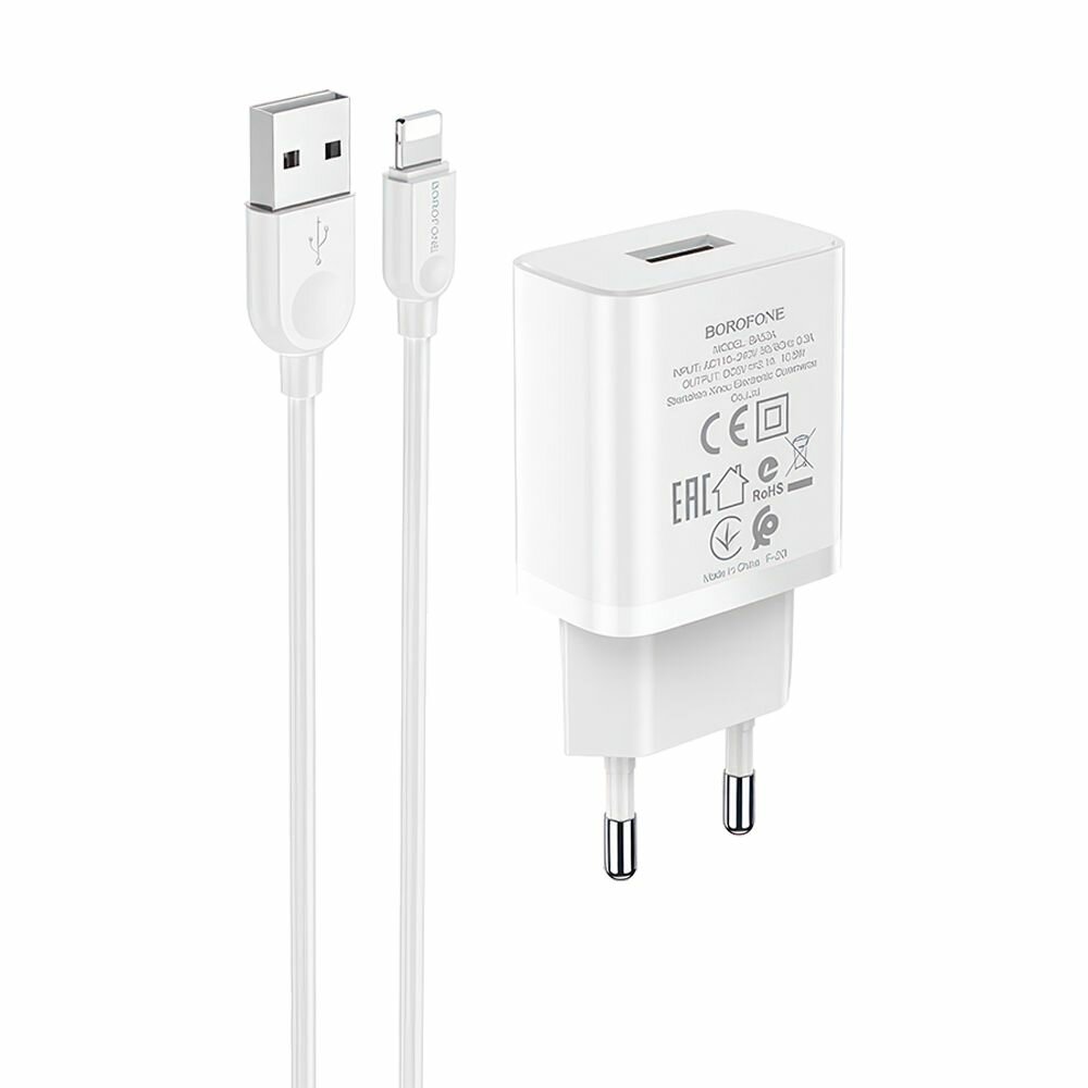 Сетевое зарядное устройство BOROFONE BA52A Gamble 1xUSB с Кабелем USB - Lightning, 2.1A, белый