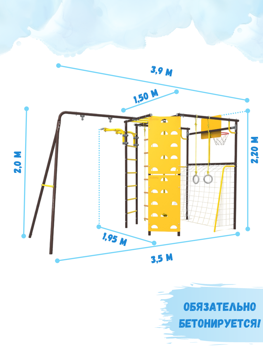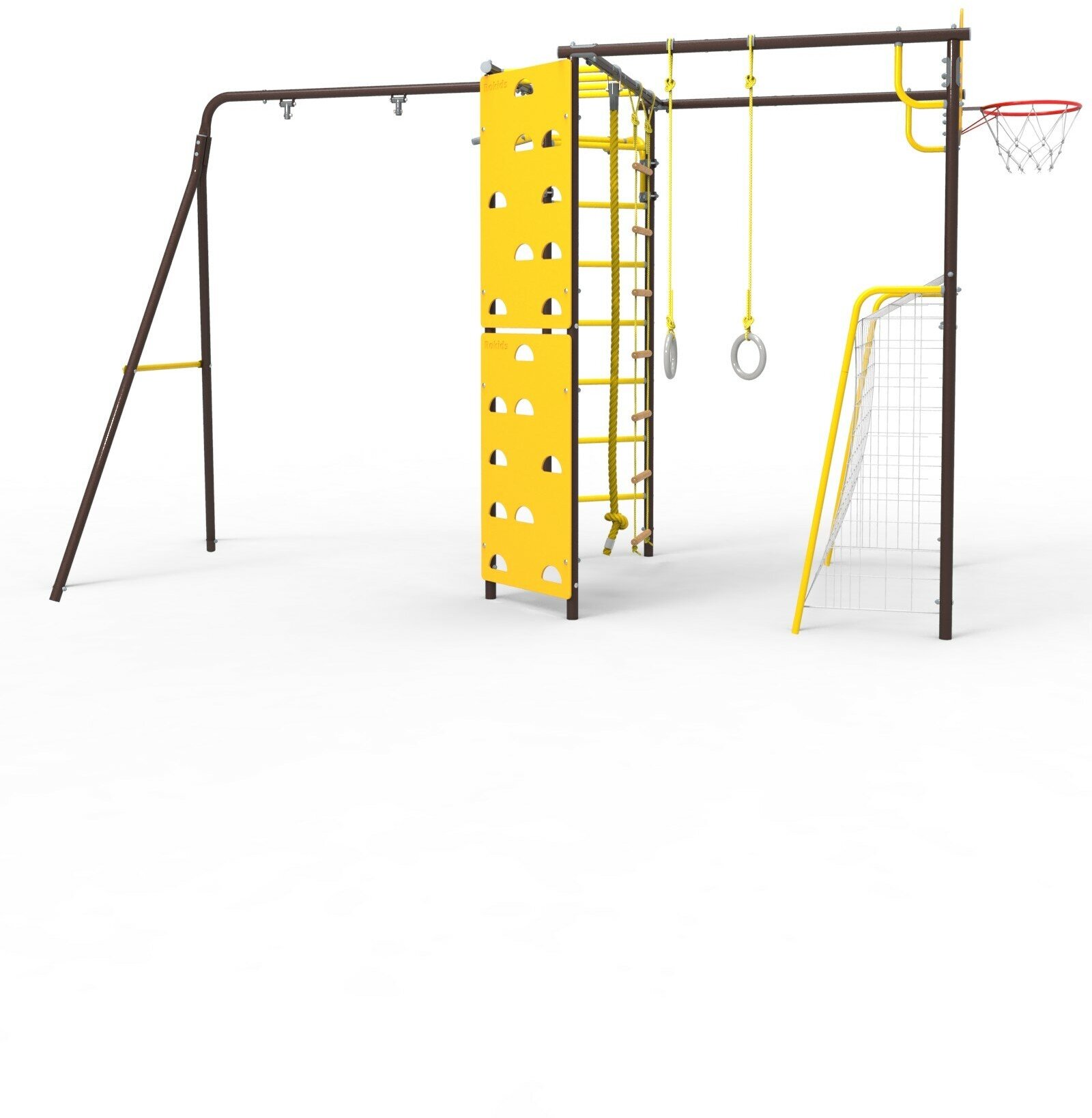 | В комплекте | баскетбольное кольцо, веревочная лестница, ворота, гимнастические кольца, канат, качели, рукоход, скалолазная стенка, трапеция, турник |