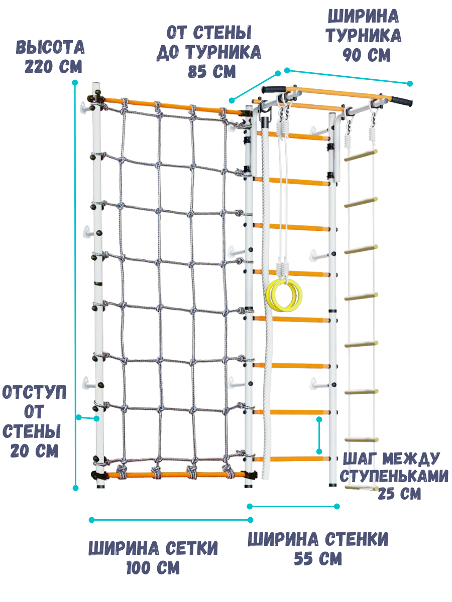 | Подробная комплектация | Комплектация: - шведская стенка с прорезиненными ступенями - широкая сетка для лазания - турник: широкий и обычный хват - кольца гимнастические - канат х/б - лестница веревочная |